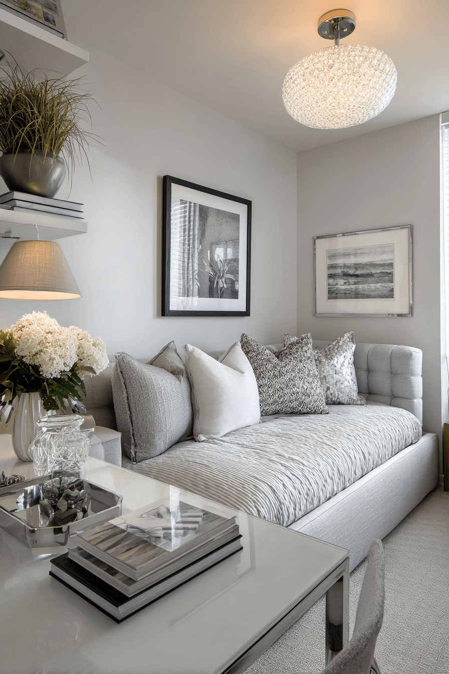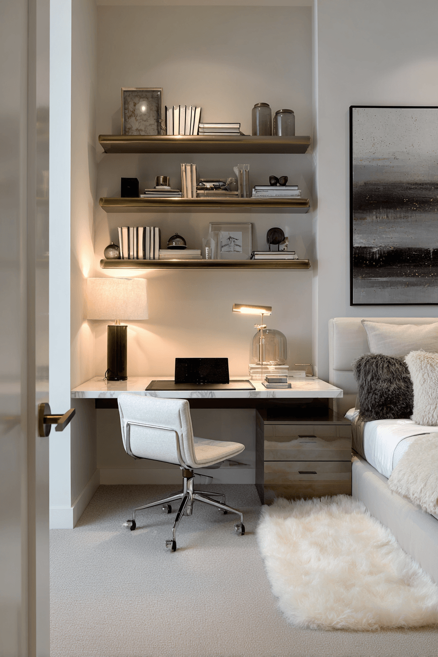 This small home office guest room transforms into a compact yet stylish workspace that feels both efficient and inviting. A streamlined desk paired with a comfortable sleep solution maximizes functionality without sacrificing design. Light tones and reflective finishes help visually expand the space. Soft textiles introduce warmth, making the room equally suited for workdays and overnight stays. Every detail is placed with intention to enhance usability. The overall feel is fresh, modern, and practical. Explore more compact room solutions now!