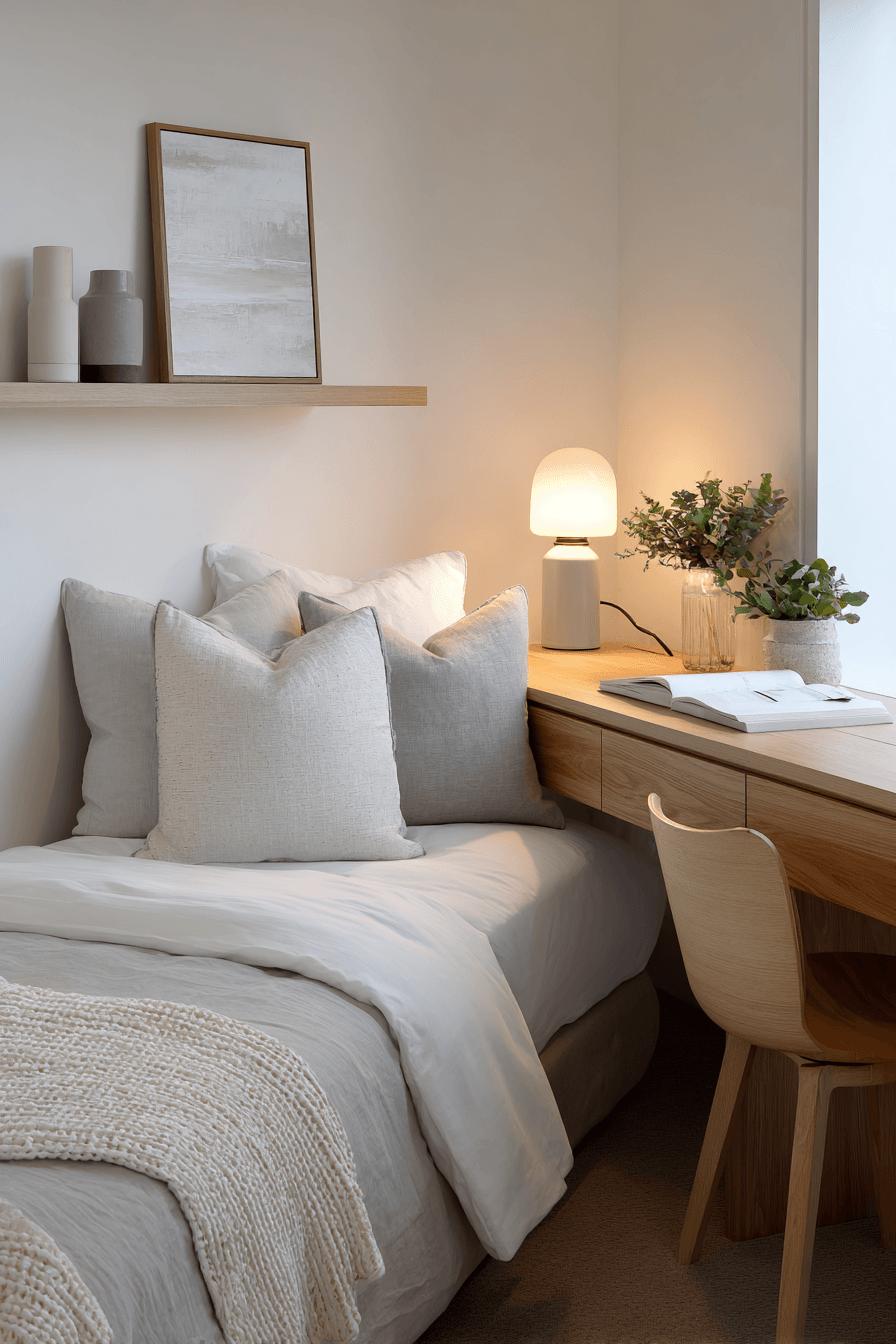 Minimalist styling enhances this small home office guest room by keeping everything calm, open, and distraction-free. Clean lines and clutter-free surfaces create a peaceful environment for focus. A compact desk and simple sleeping setup maintain an airy layout. Natural light plays a key role in brightening the room. The overall design feels modern, functional, and effortless. It’s ideal for both productivity and relaxation. Explore minimalist room inspiration now!