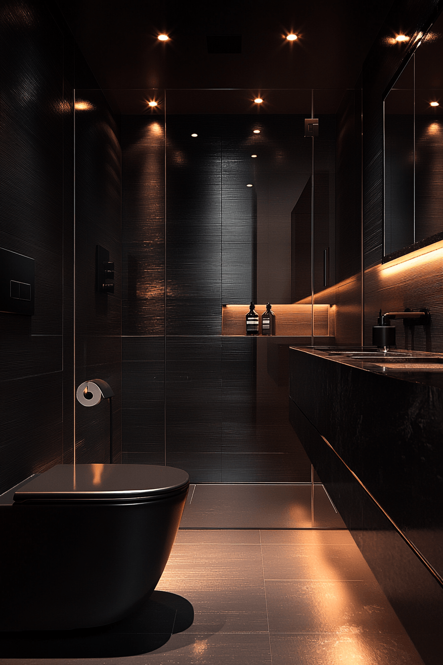 Dark finishes create a dramatic and sophisticated atmosphere filled with depth. Reflective surfaces enhance small luxury bathroom layouts by balancing the darker tones. Strategic lighting prevents heaviness. Sleek fixtures add modern elegance. Minimal styling maintains structure. The mood feels bold and luxurious. Explore this dramatic bathroom design.