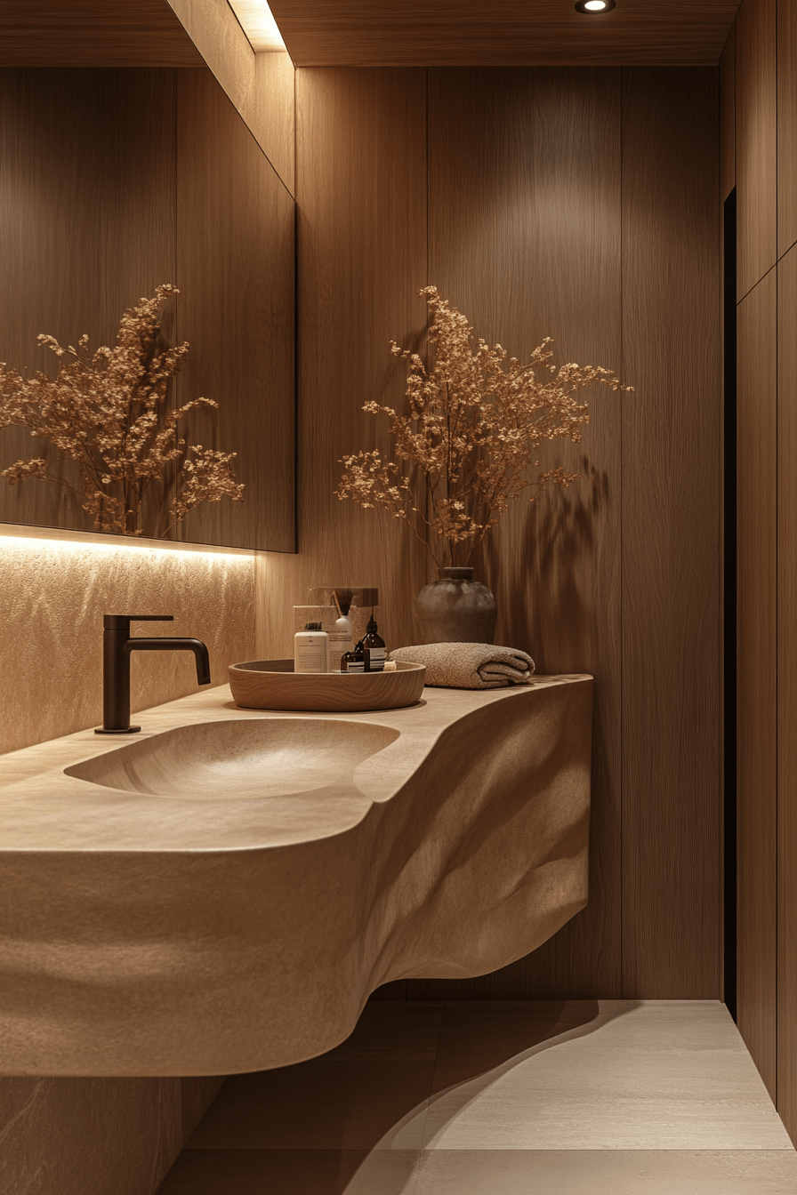 Sculptural vanities become statement pieces that define the entire design. Smooth finishes enhance small luxury bathroom styling by highlighting clean lines. Compact layouts maximize functionality. Subtle lighting draws attention to key features. Minimal decor keeps the look balanced. The mood feels artistic and elevated. Showcase statement design in your bathroom.