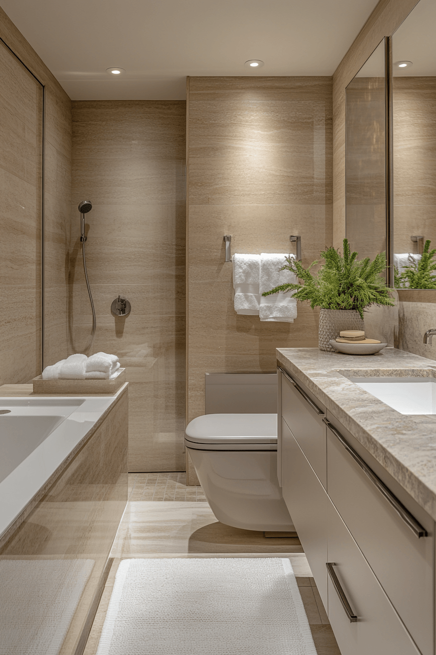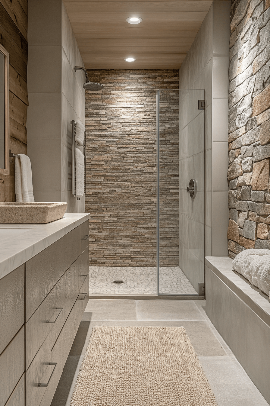Natural stone textures add depth and organic elegance to a serene bathroom setting. Neutral palettes enhance small luxury bathroom designs by keeping everything cohesive and calming. Streamlined fixtures maintain a clean, modern look. Subtle lighting highlights natural variations beautifully. Minimal decor prevents distraction. The mood feels grounded and spa-like. Bring stone elegance into your bathroom.