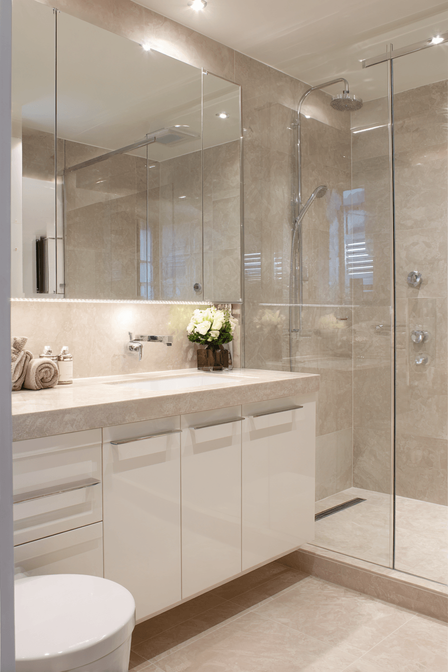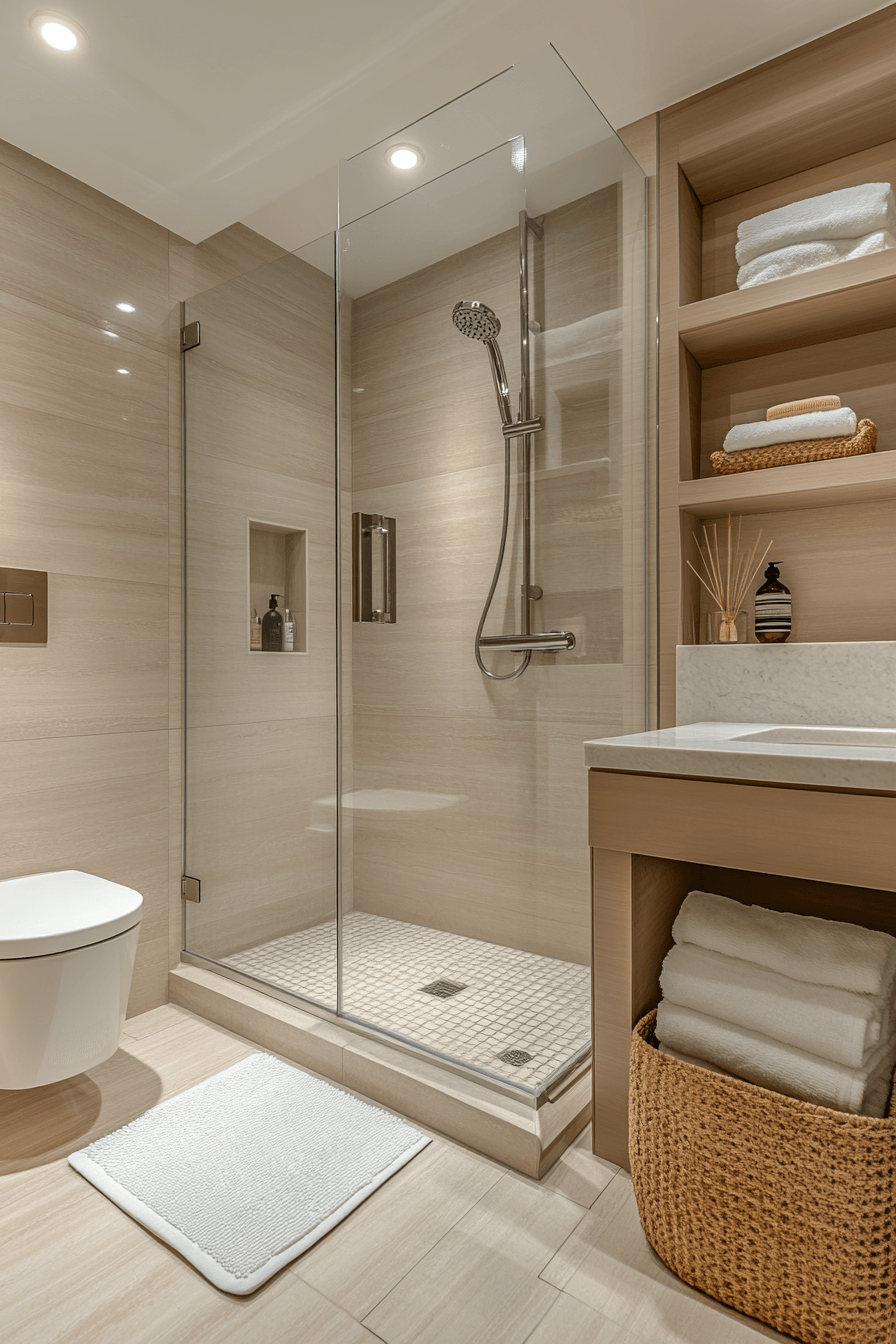 Modern shower setups add both style and function to compact spaces. Glass enclosures enhance small luxury bathroom layouts by maintaining openness. Sleek fixtures add a polished touch. Built-in storage keeps essentials organized. Clean lines ensure a cohesive look. The mood feels fresh and modern. Upgrade your shower space today.
