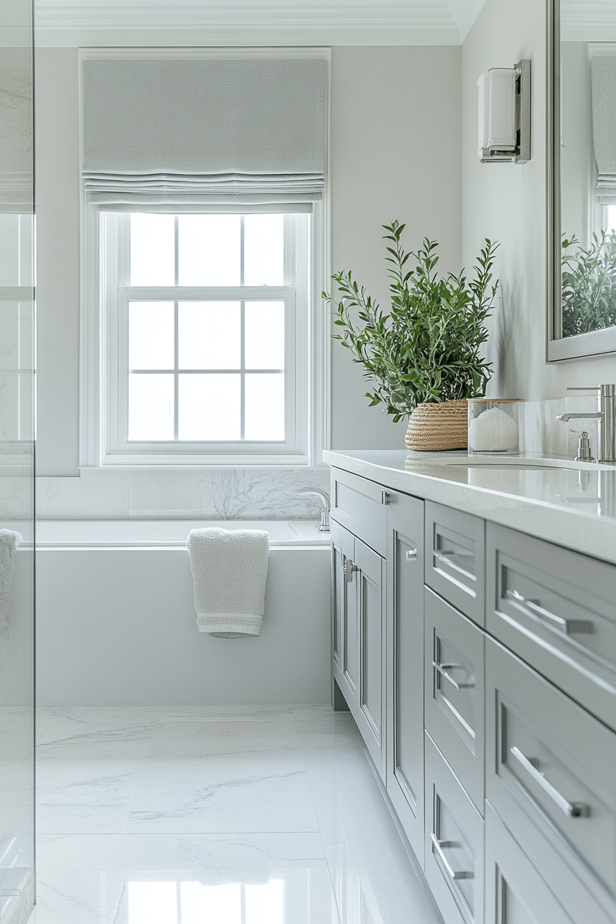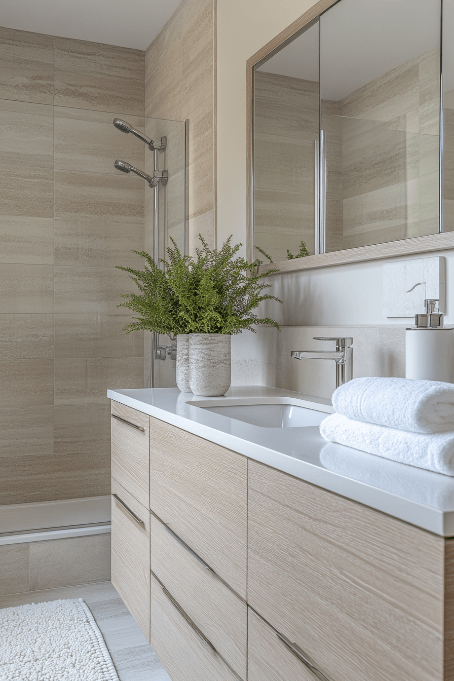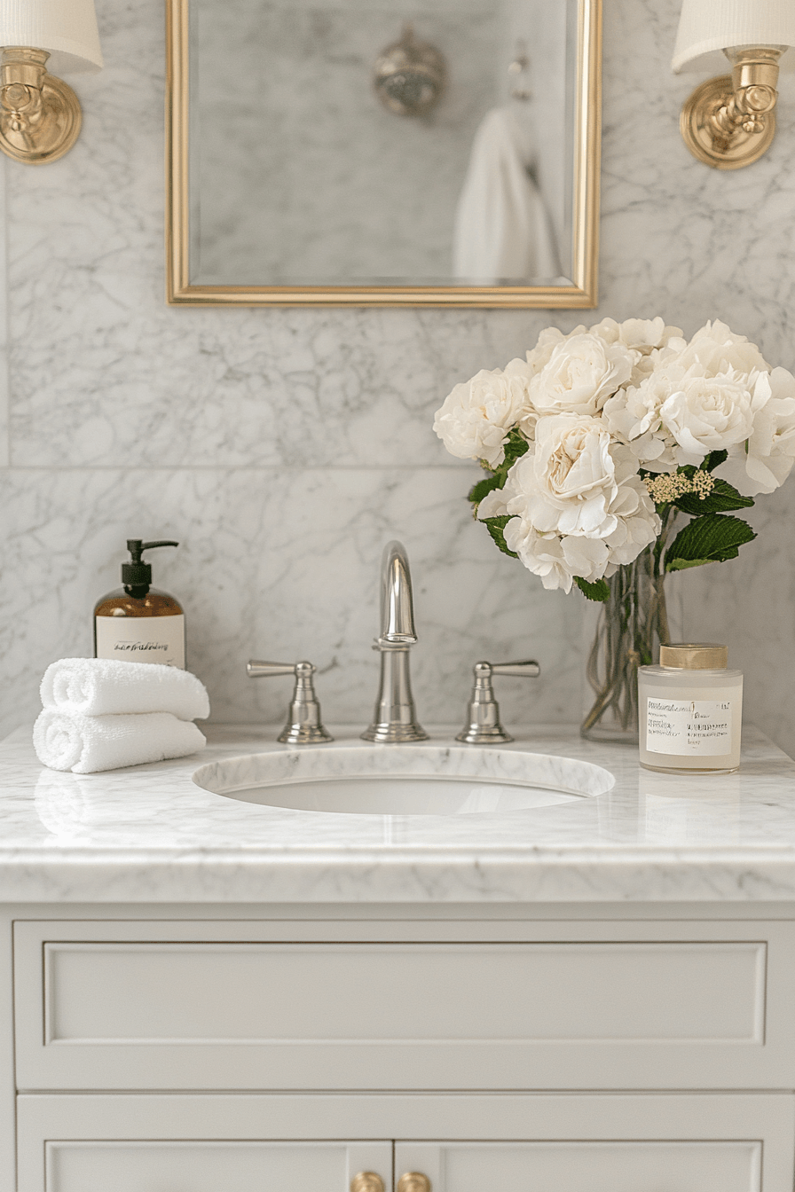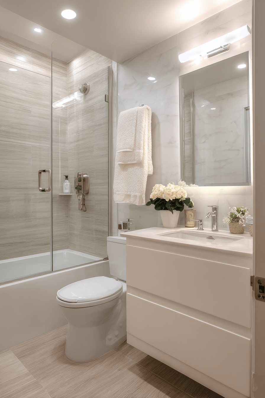 Subtle glam accents introduce elegance without excess, creating a balanced and refined look. Light finishes enhance small luxury bathroom styling by keeping everything bright. Sleek fixtures add a modern touch. Minimal decor maintains clarity. Soft textures add warmth. The mood feels polished and inviting. Bring soft glam into your bathroom.