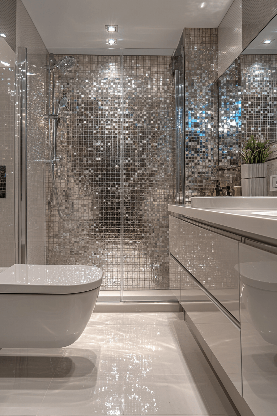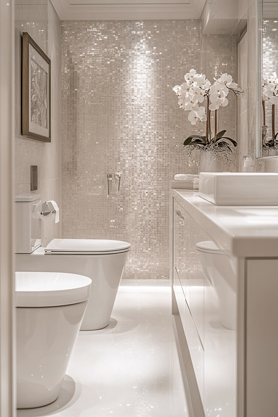 Crystal lighting introduces glamour while enhancing brightness throughout the room. Reflective details enhance small luxury bathroom styling by adding sparkle and elegance. Soft tones balance the shine. Minimal decor keeps the look refined. Light reflections create a glowing effect. The mood feels luxurious and radiant. Add a touch of glamour today.