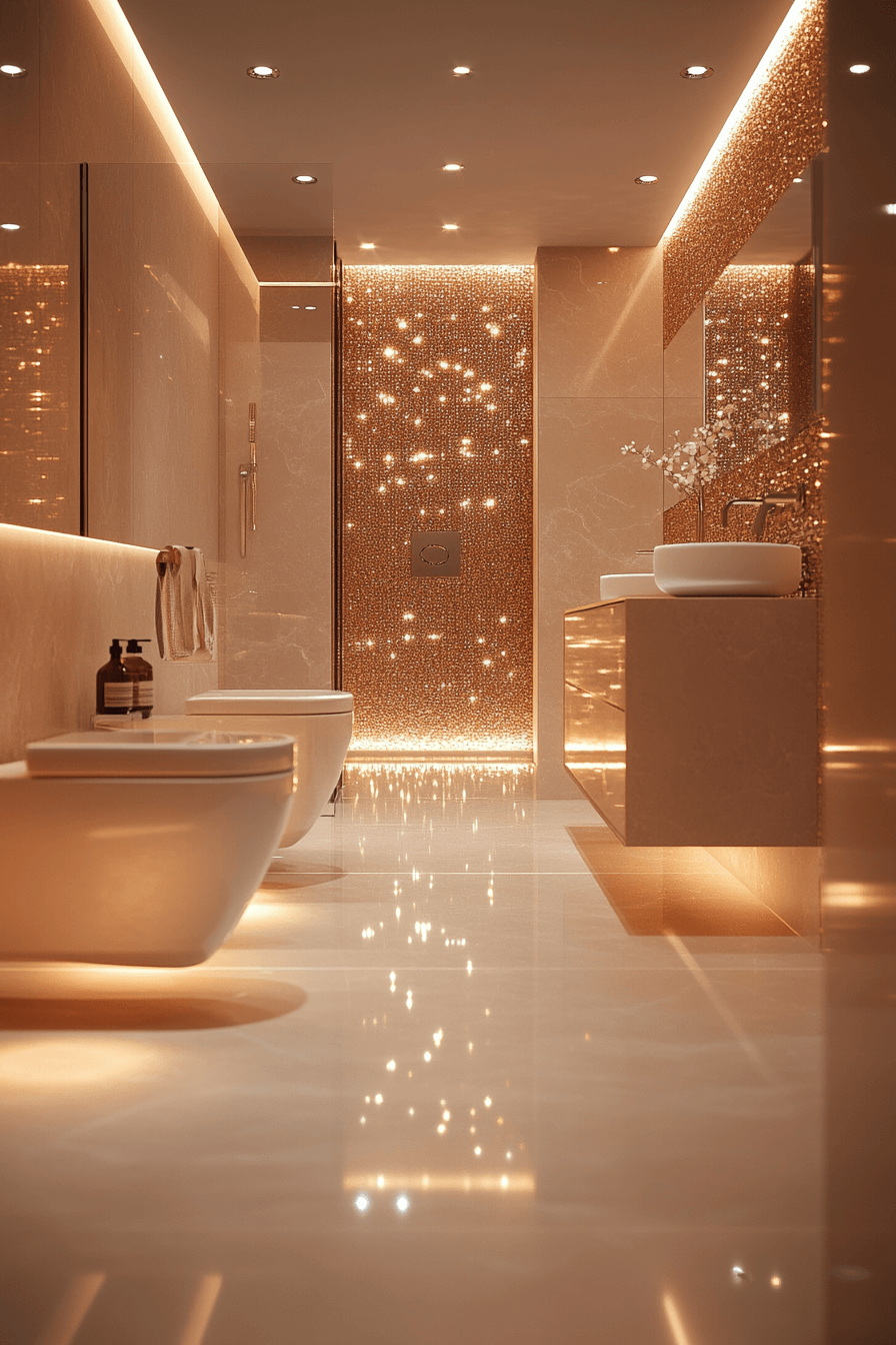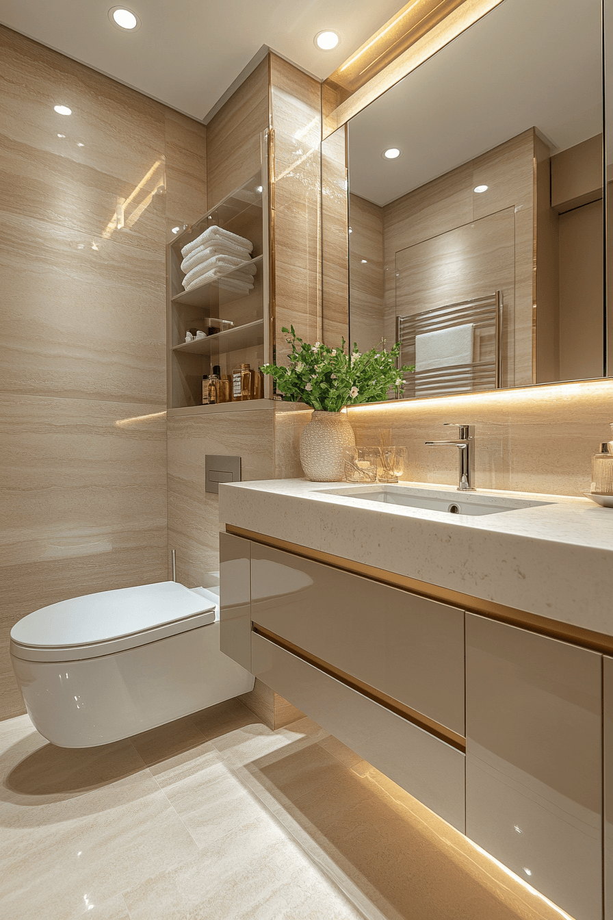 Warm metallic details introduce richness and depth into a sleek, modern layout. Reflective finishes enhance small luxury bathroom styling by expanding brightness throughout the room. Clean lines reduce clutter while maintaining a high-end feel. Light tones balance the bold accents beautifully. A floating vanity keeps the layout open and airy. The atmosphere feels radiant and refined. Elevate your space with golden accents.
