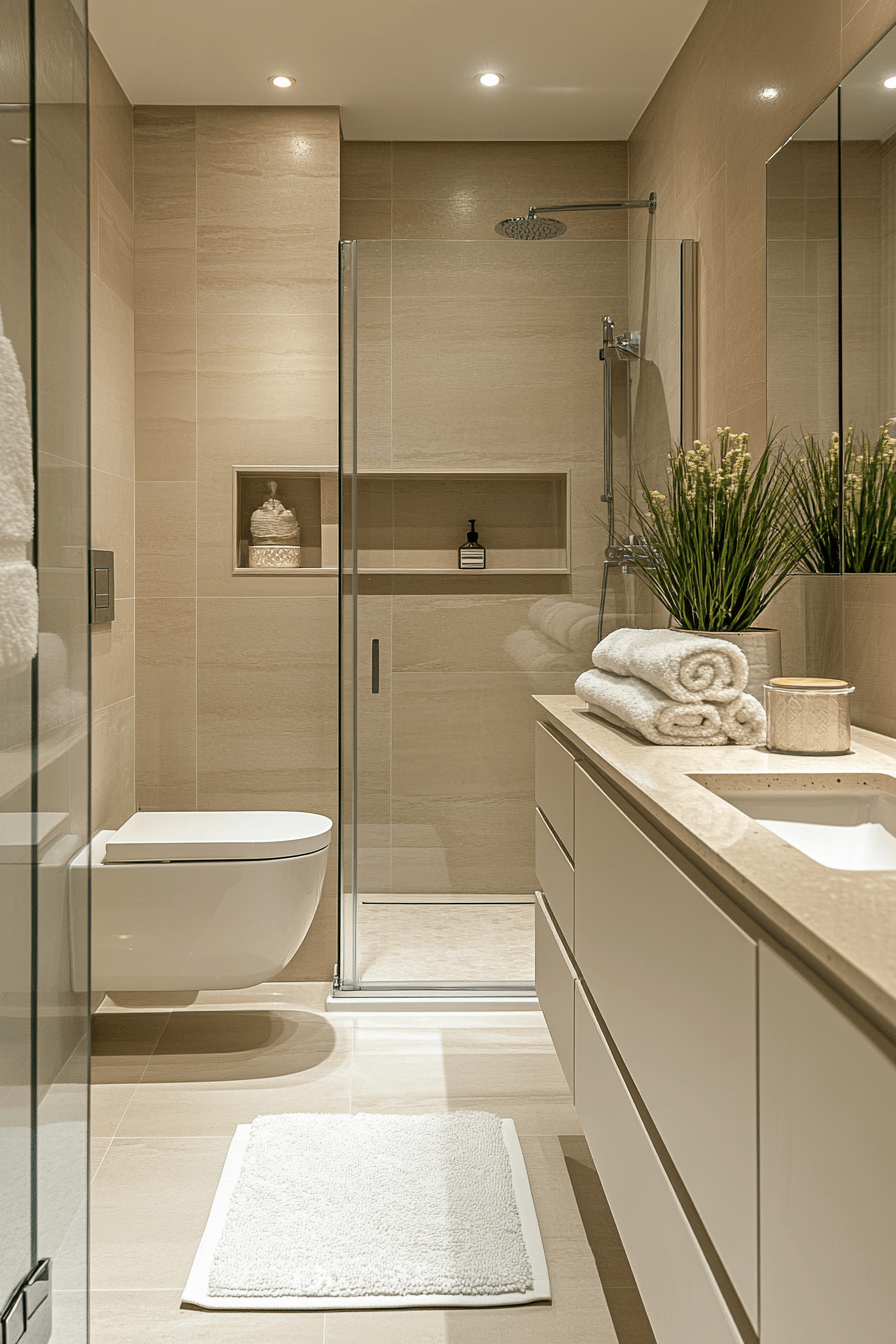 Smart niche designs maximize storage while maintaining a clean and modern layout. Built-in features enhance small luxury bathroom ideas by keeping essentials organized. Light tones maintain openness. Compact fixtures ensure efficiency. Clean lines keep everything streamlined. The mood feels practical and polished. Optimize your bathroom space.