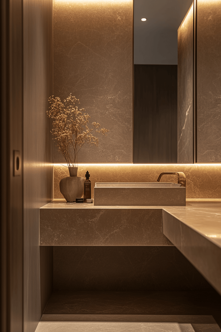 Layered textures and high-end finishes create a rich and immersive environment. Balanced materials enhance small luxury bathroom concepts by combining bold and subtle elements. Light tones prevent the space from feeling heavy. Clean lines maintain organization. Accent lighting adds dimension. The mood feels indulgent and refined. Experience layered luxury design.