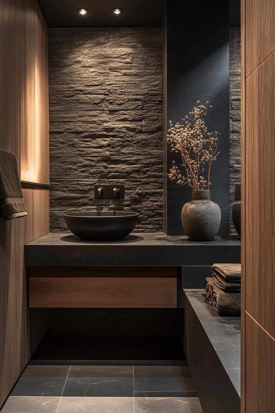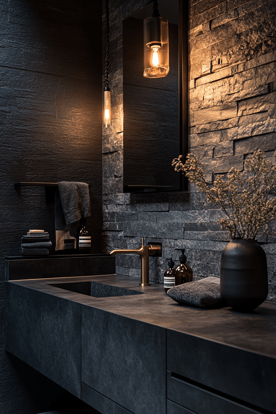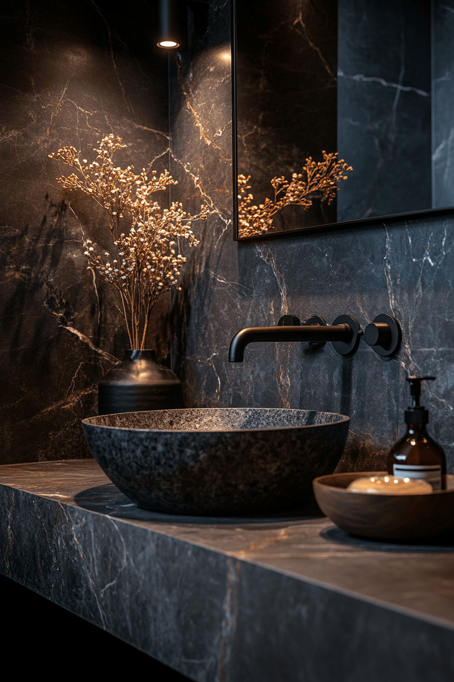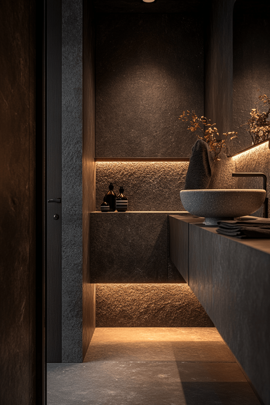Natural stone elements bring warmth and organic texture into darker spaces. This small moody bathroom balances raw materials with sleek finishes. Subtle lighting enhances the natural patterns of the stone. The mix of textures creates depth without clutter. Minimal fixtures keep the look modern and clean. The result feels grounded and elegant. Explore stone-inspired design ideas.
