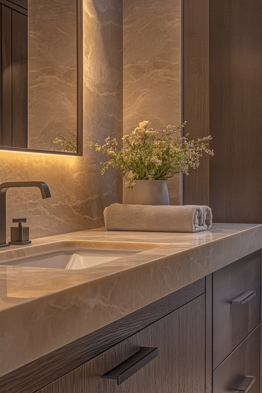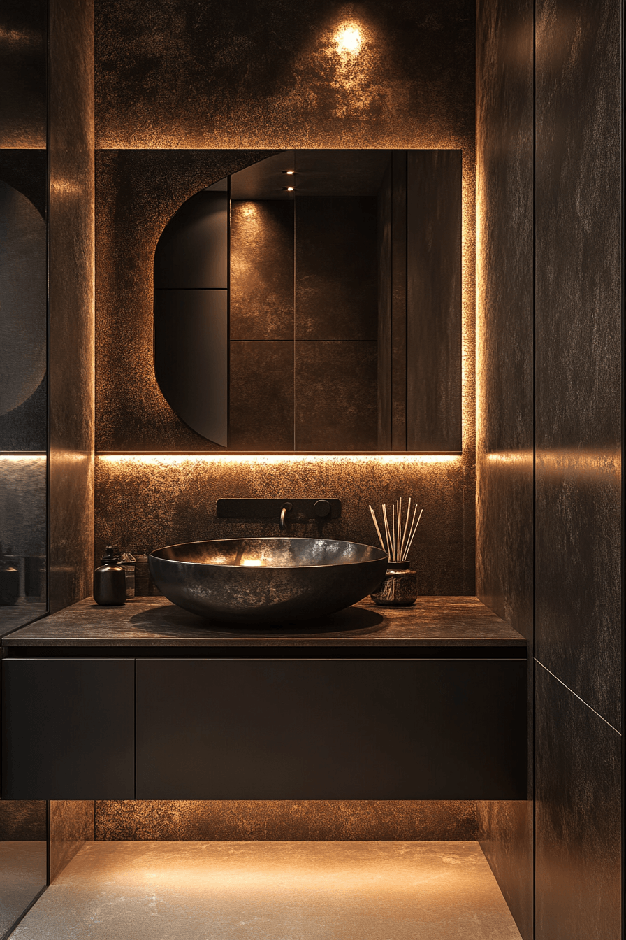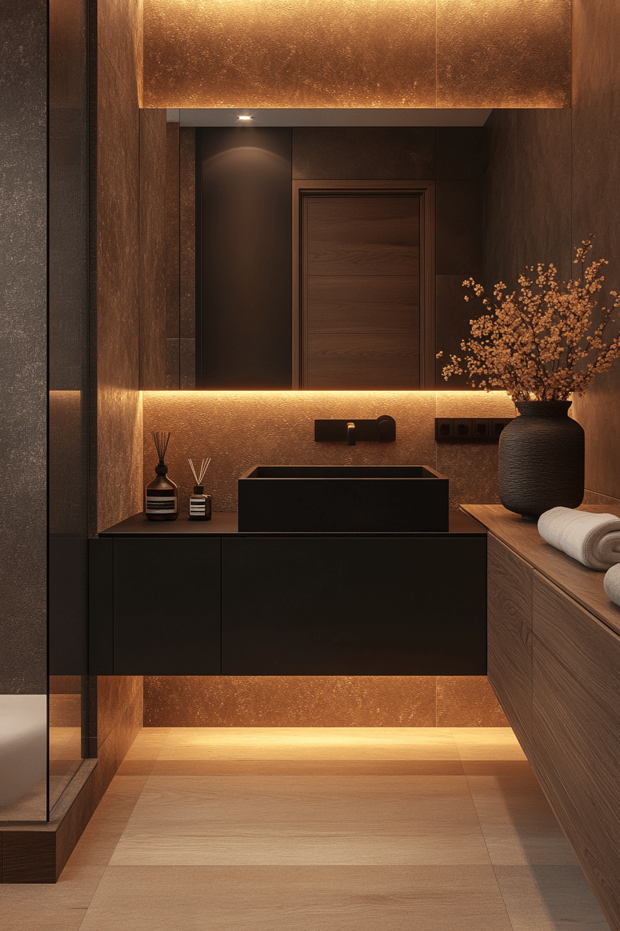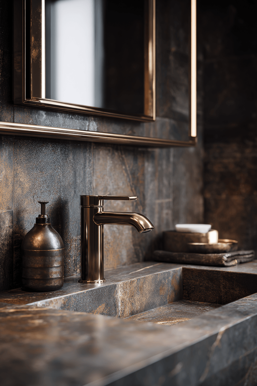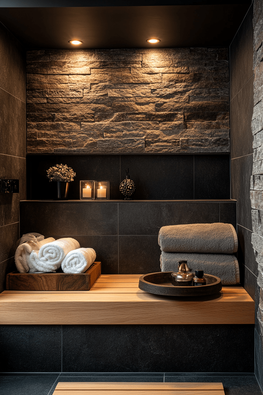 Natural stone elements bring warmth and organic texture into darker spaces. This small moody bathroom balances raw materials with sleek finishes. Subtle lighting enhances the natural patterns of the stone. The mix of textures creates depth without clutter. Minimal fixtures keep the look modern and clean. The result feels grounded and elegant. Explore stone-inspired design ideas.