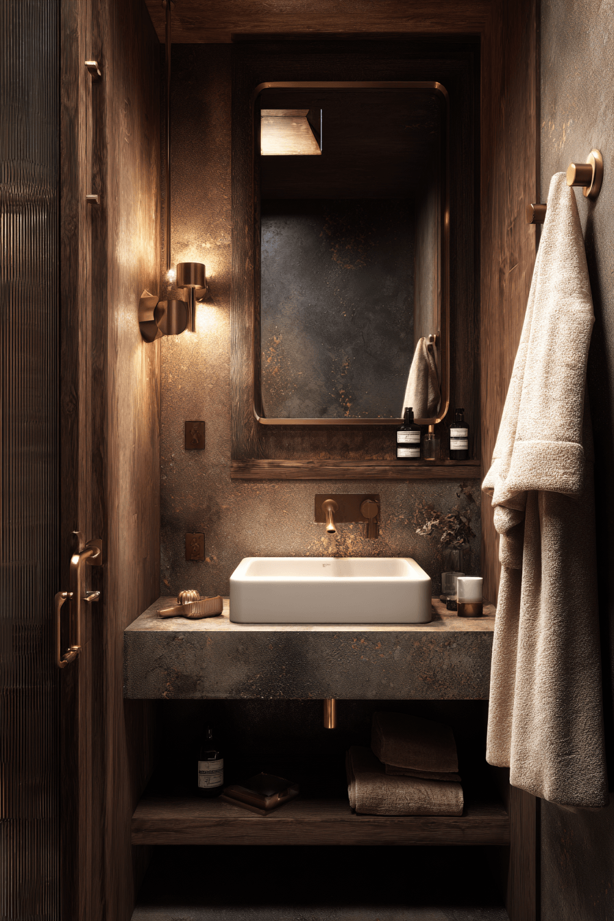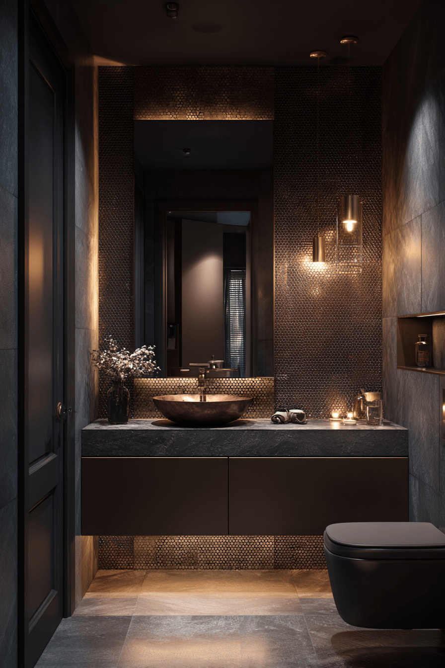 A compact space can feel incredibly luxurious when layered with deep tones and refined textures. This small moody bathroom uses rich finishes and soft lighting to create a cozy, high-end atmosphere. Dark hues wrap the room in warmth while reflective accents prevent it from feeling enclosed. A streamlined vanity keeps the layout clean and visually open. Subtle decor pieces add personality without cluttering the design. The result feels intimate, polished, and elevated. Click to bring this luxe mood to life.