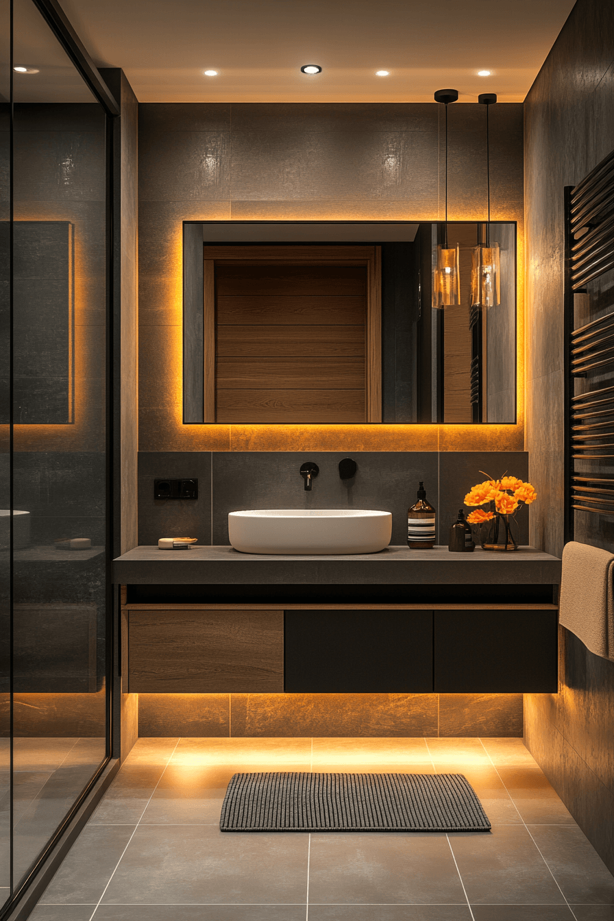 Warm lighting can completely transform a dark palette into something inviting. This small moody bathroom uses layered glow to add depth and softness. Reflective elements amplify the warmth of the light. Dimmer options allow flexibility throughout the day. The balance between shadow and glow creates visual interest. The result feels cozy and elevated. Click to perfect your lighting design.