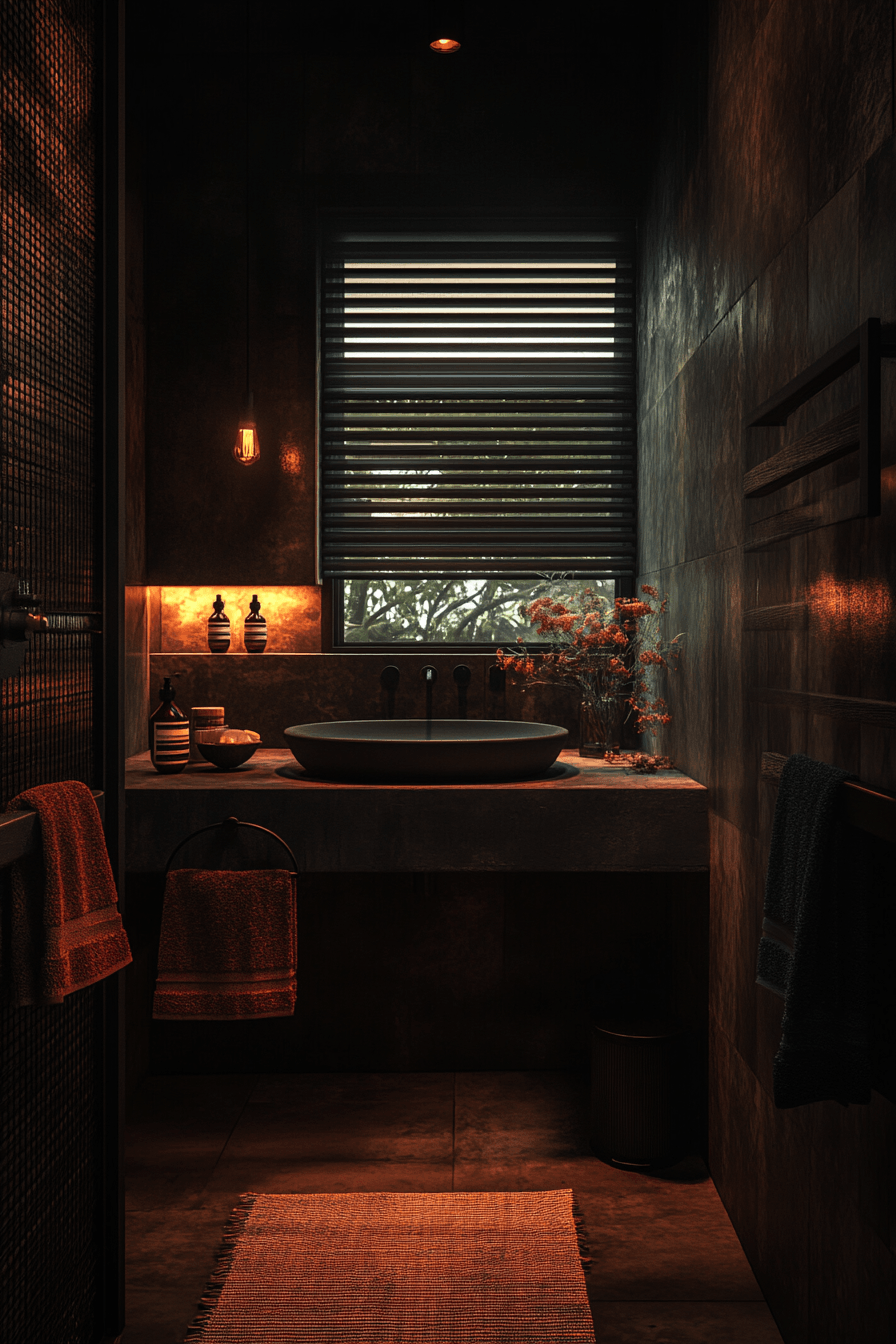 Soft, diffused lighting can transform a dark bathroom into a welcoming retreat. This small moody bathroom focuses on gentle illumination rather than brightness. Warm tones enhance the cozy atmosphere and add depth. Layered lighting defines the space without overwhelming it. Minimal decor keeps the mood calm and uncluttered. The result is soothing and balanced. Discover how to create a soft-lit sanctuary.