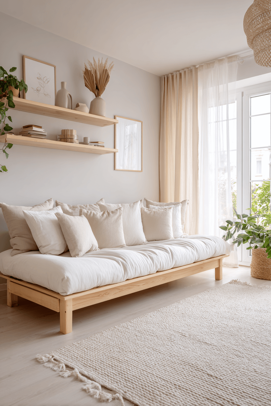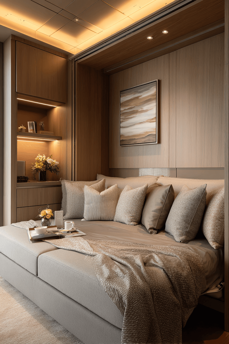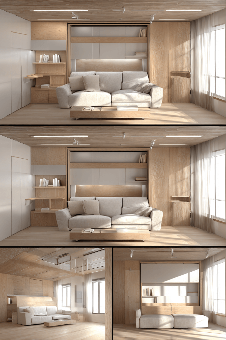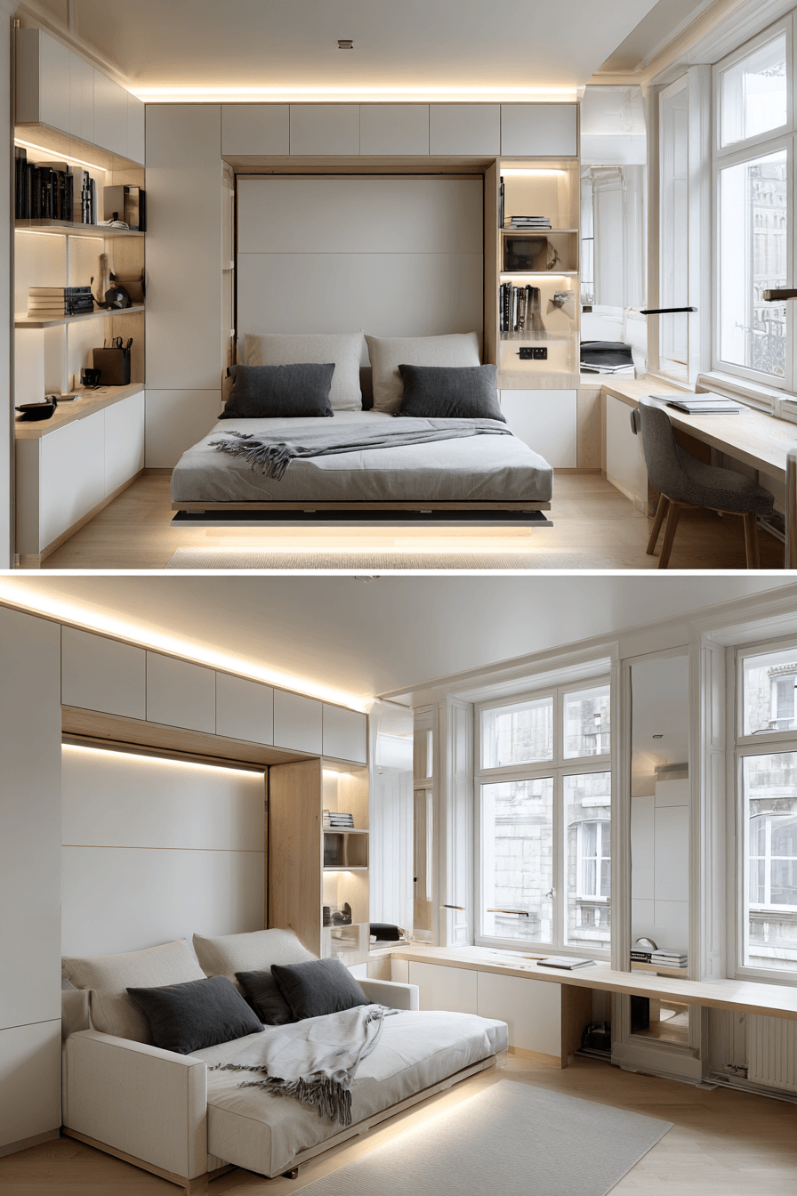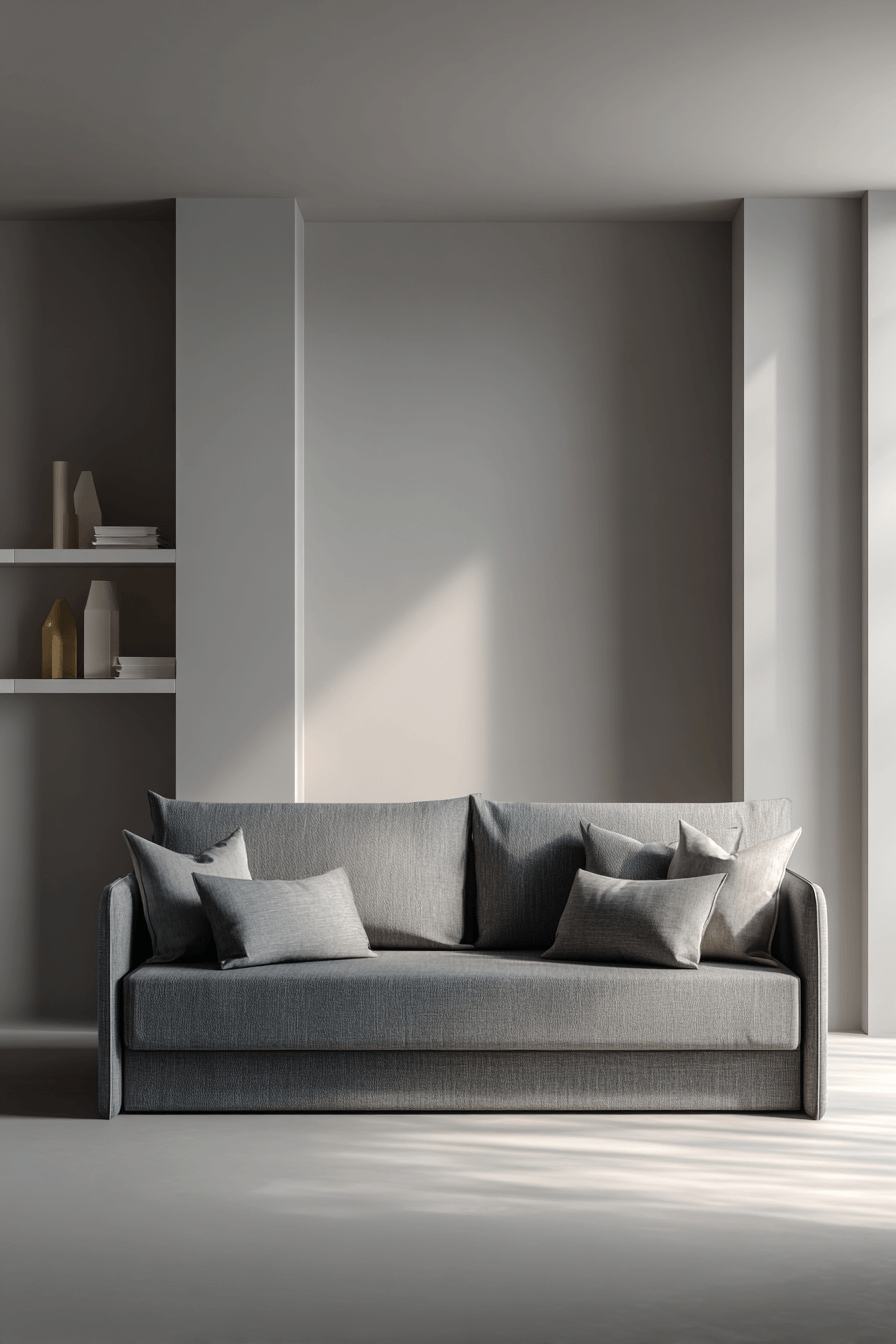 Crisp silhouettes and refined finishes elevate a sofa bed living room rooted in Elegant Living Room Design. Sleek upholstery and minimal hardware maintain modern polish. Floating shelves keep the floor plan open and airy. Concealed bedding compartments maintain order. Simplicity keeps everything calm and intentional. Tap to simplify your style effortlessly!