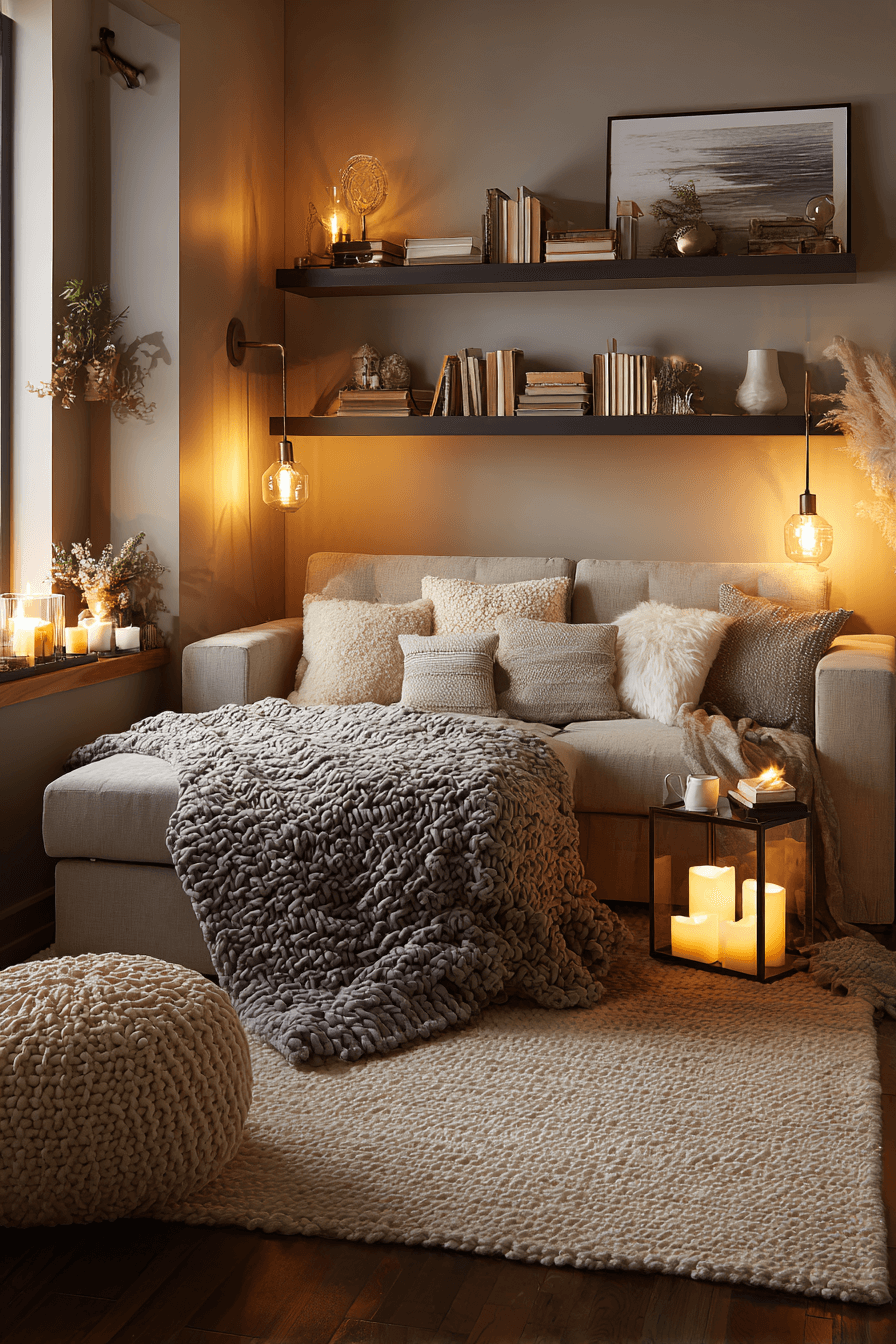 A plush nook transforms a sofa bed living room into a welcoming retreat while maintaining Elegant Living Room Design appeal. Oversized cushions, soft throws, and warm lamps create irresistible comfort. Textured rugs ground the layout visually. Hidden storage keeps clutter out of sight. The space feels both practical and indulgent. Tap to design your own cozy corner!
