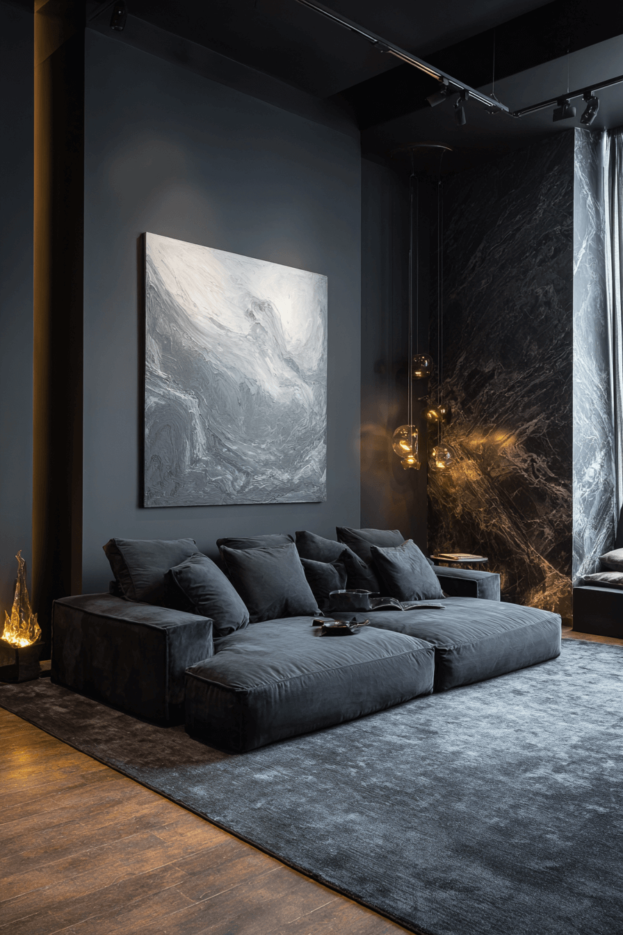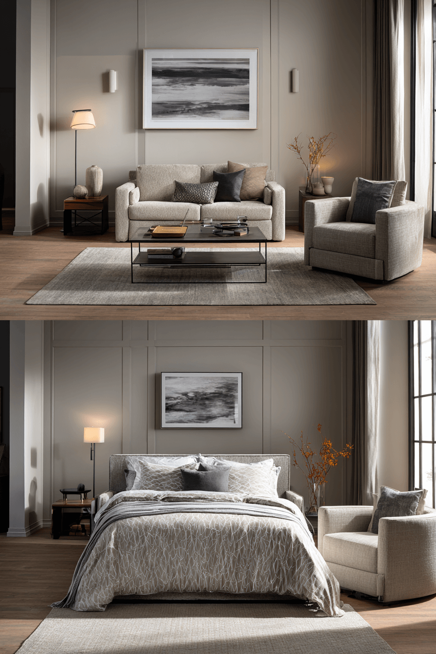 Layered gray tones create a calming sofa bed living room that reflects timeless Elegant Living Room Design. Textured pillows and cozy throws add depth. Warm lighting softens the cool palette beautifully. Matte black or silver accents enhance modern appeal. Gray anchors evolving décor with ease. Click to explore this soothing style!