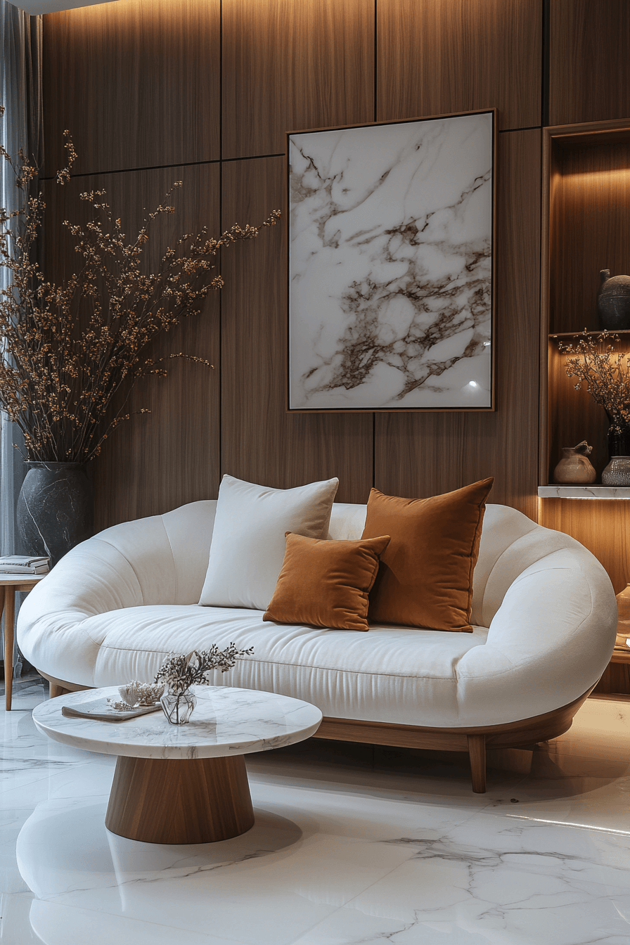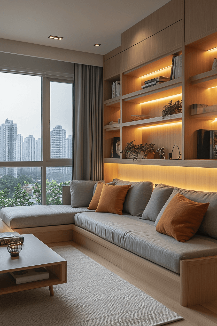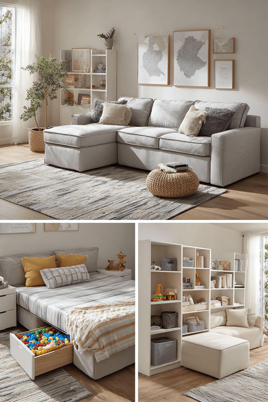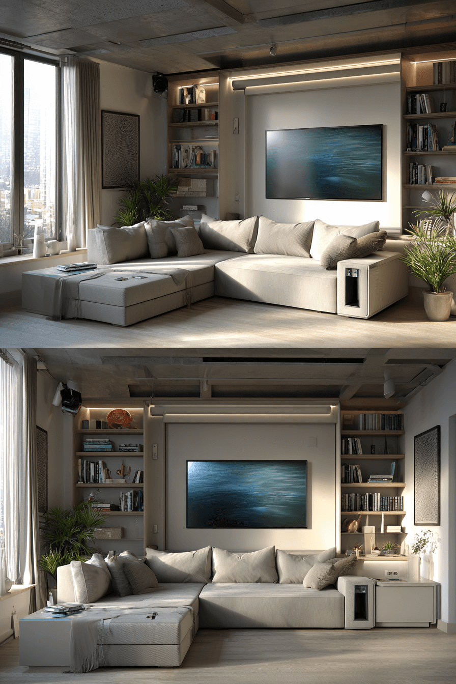 Concealed compartments elevate a functional sofa bed living room while preserving Elegant Living Room Design aesthetics. Lift-up storage and hidden drawers maintain organization. Sleek finishes keep the look modern. Balanced décor softens practicality with warmth. Thoughtful storage enhances both beauty and usability. Tap to discover concealed convenience!