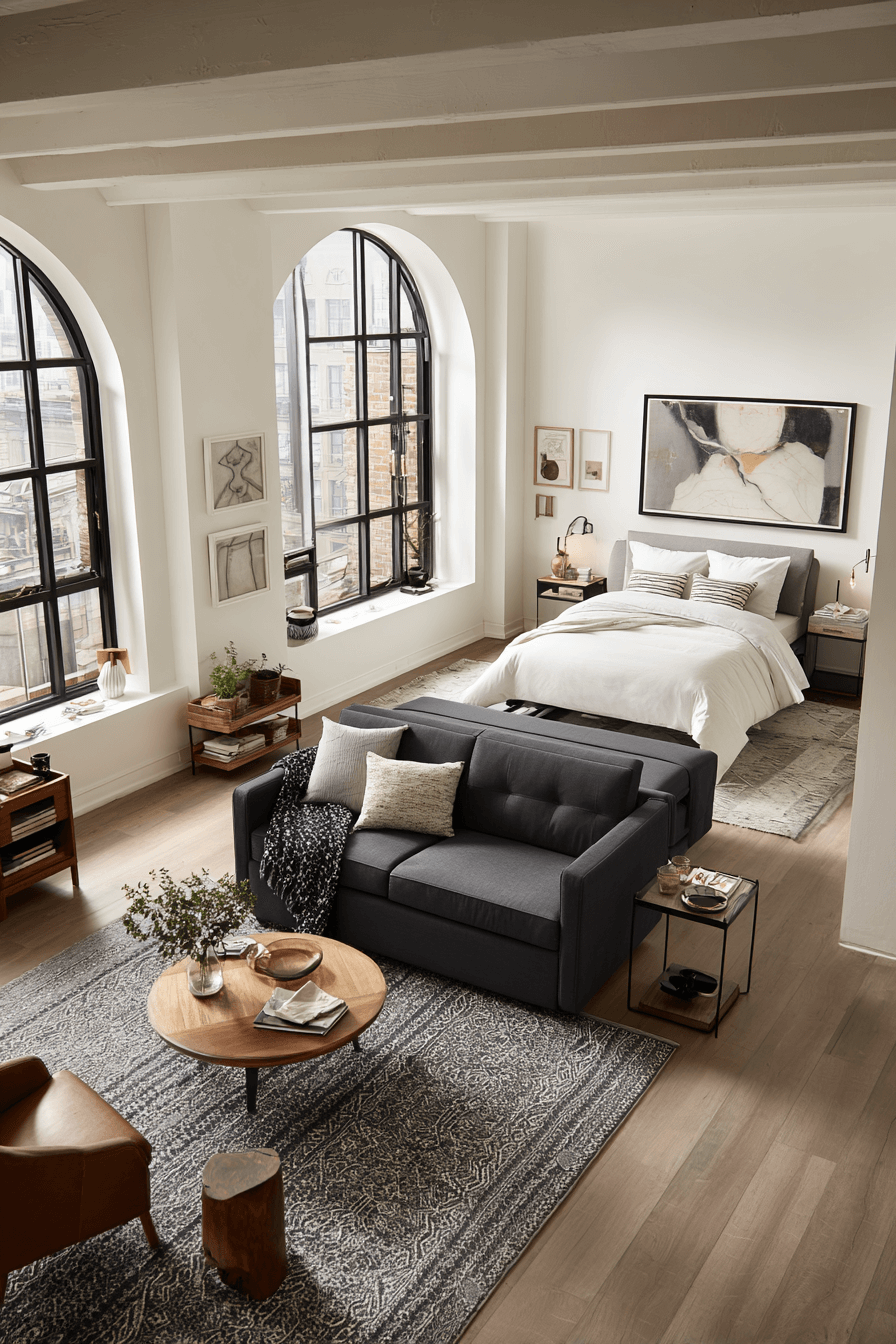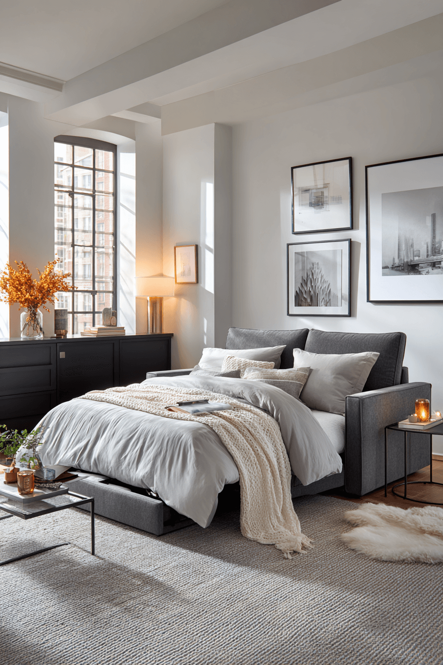 Vertical storage and light-reflective finishes brighten a compact sofa bed living room designed around Elegant Living Room Design principles. The sleeper becomes a focal point instead of an afterthought. Slim tables and multifunctional pieces maintain flow. Light fabrics preserve openness. Thoughtful planning maximizes square footage. Discover smart studio styling now!
