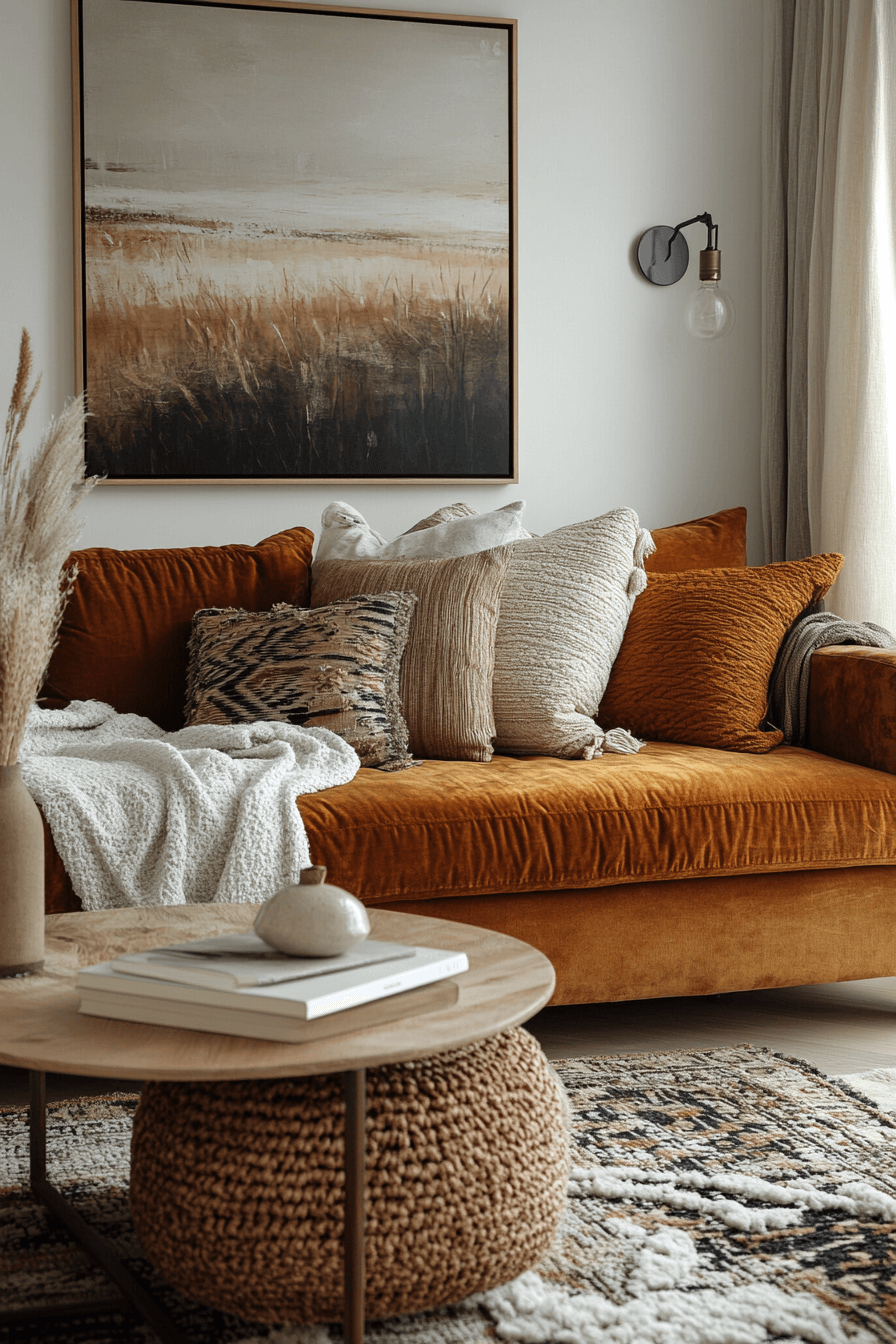 Layered fabrics enrich a modern sofa bed living room grounded in tactile Elegant Living Room Design. Velvet, boucle, and woven textiles add dimension. Subtle patterns introduce movement without chaos. Neutral tones maintain balance. Decorative lighting enhances depth and warmth. Click to add texture-driven elegance!