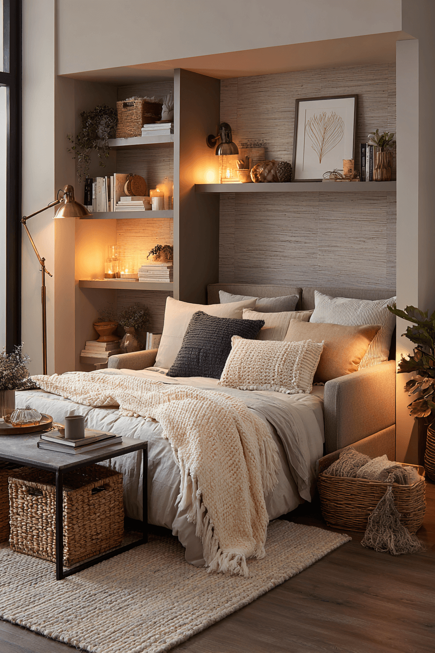 Built-in shelving and streamlined cabinetry enhance a modern sofa bed living room grounded in Elegant Living Room Design. Hidden storage keeps the space tidy and elevated. The sleeper feels integrated rather than improvised. Layered lighting balances structure with warmth. Smart planning transforms functionality into visual appeal. Click to explore space-saving brilliance!