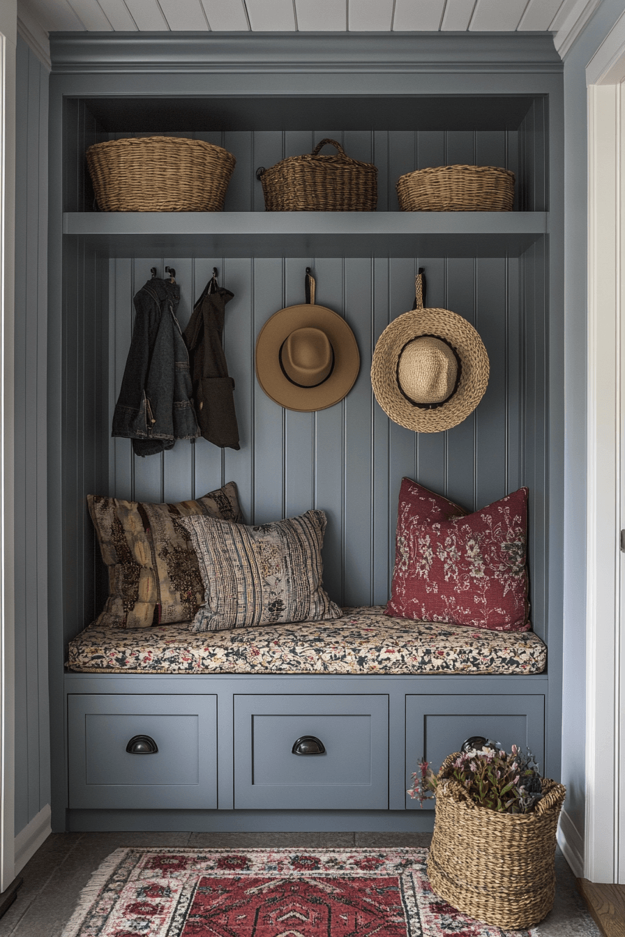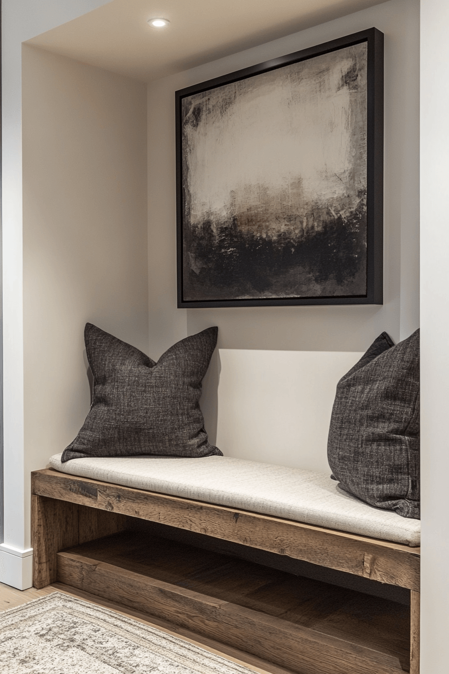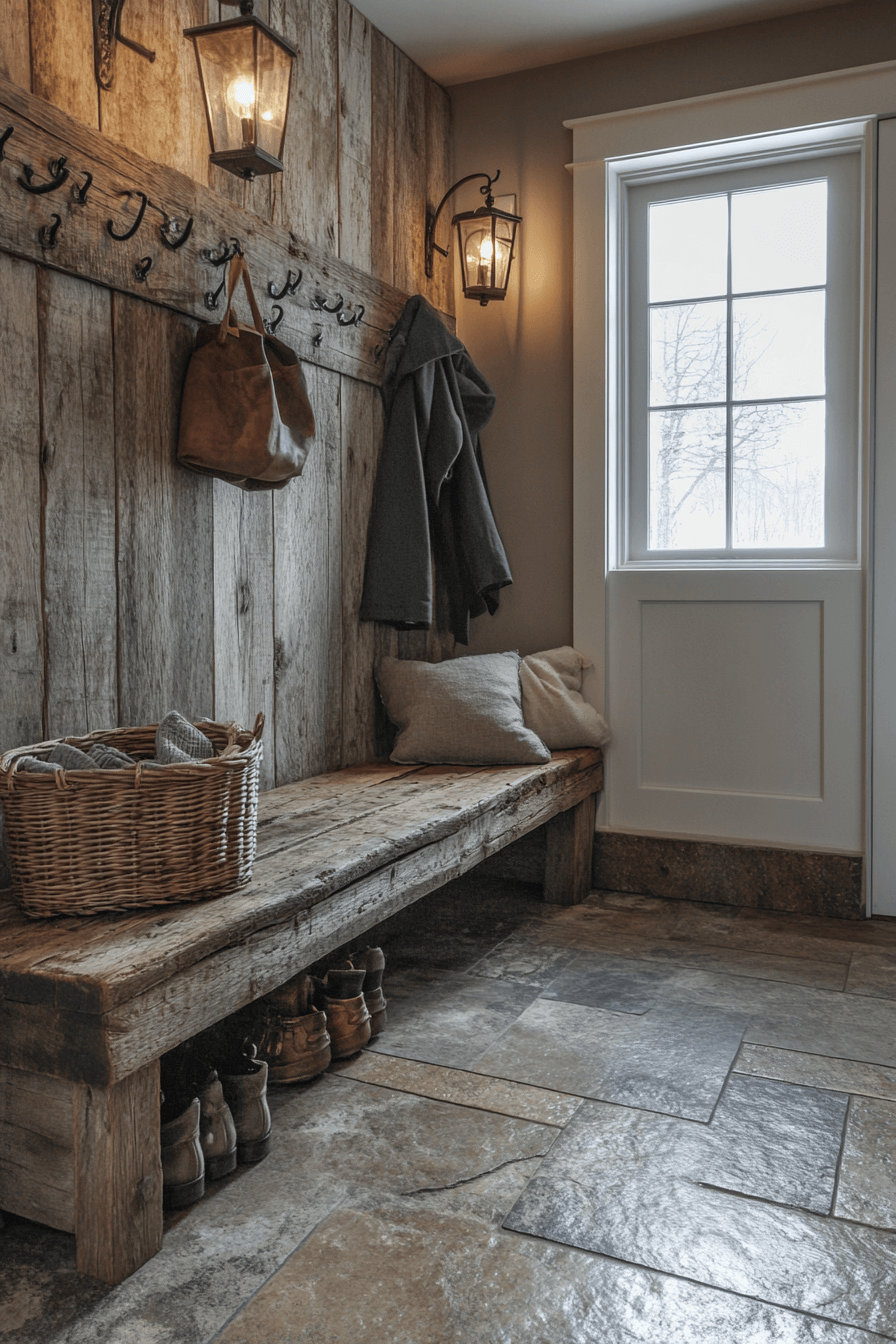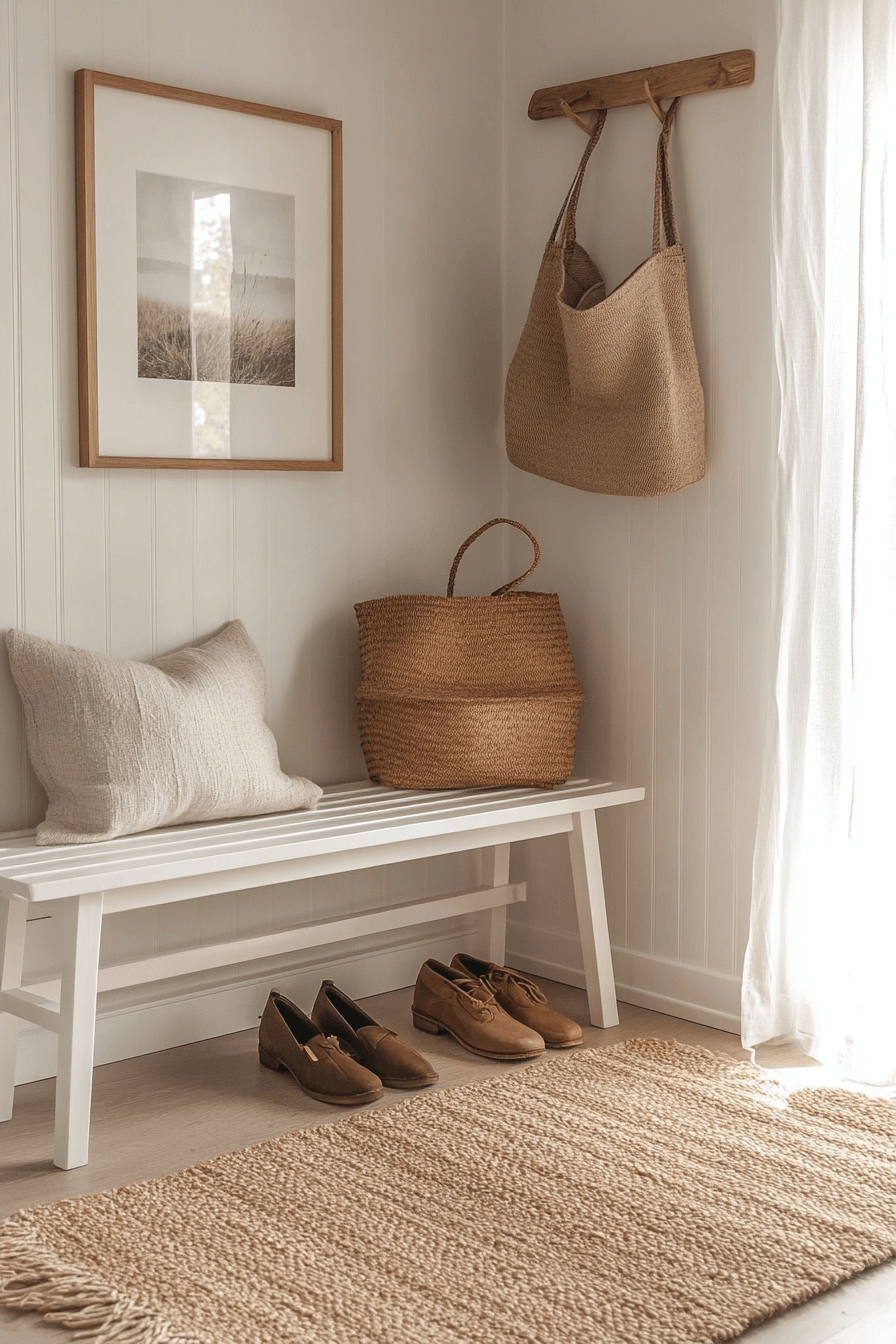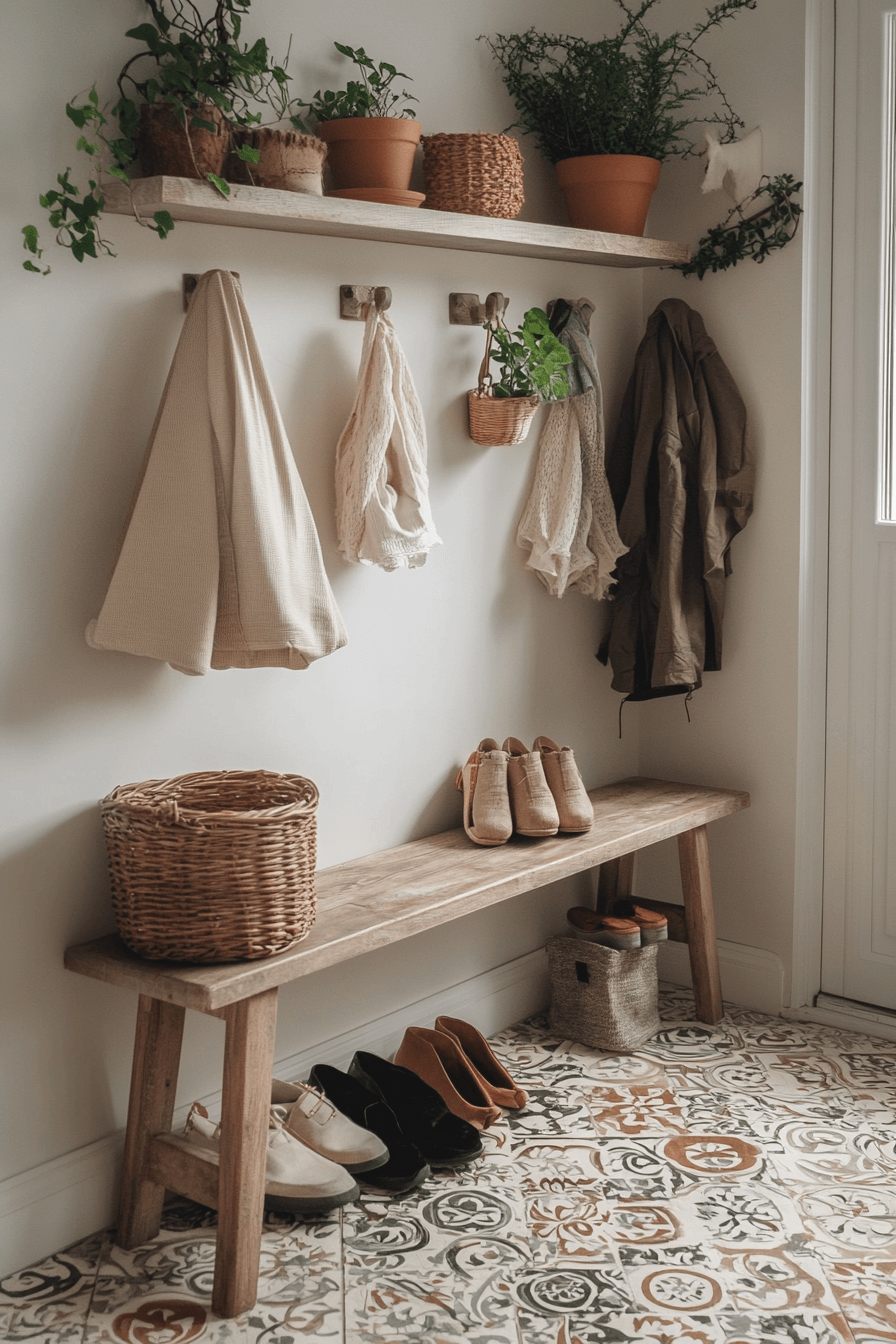 Earthy materials ground a tiny apartment entryway styled with rustic charm. Natural textures add warmth while compact furniture keeps things practical. Storage benches serve double duty without adding bulk. The space feels cozy and balanced. Small entries gain soul.