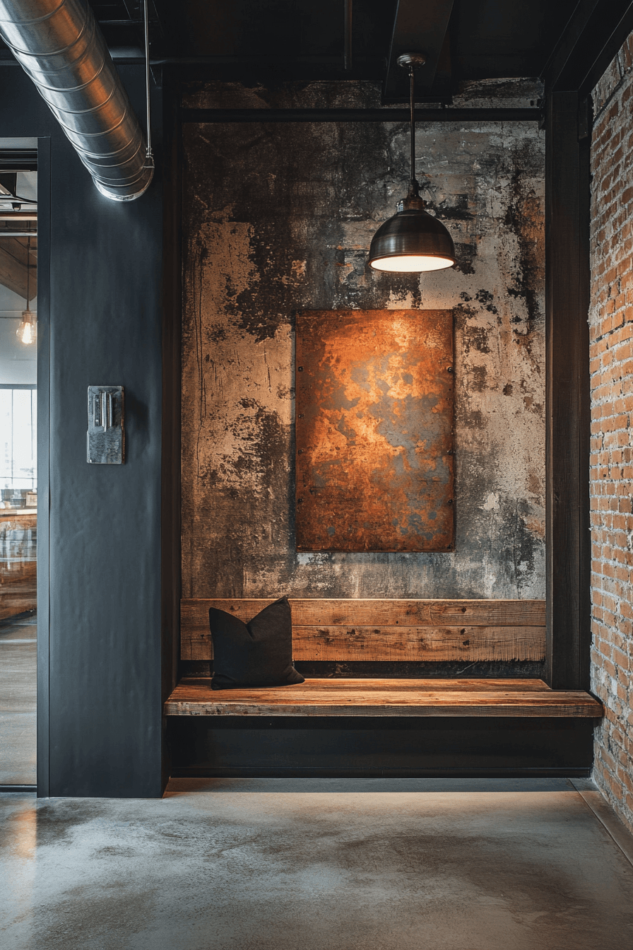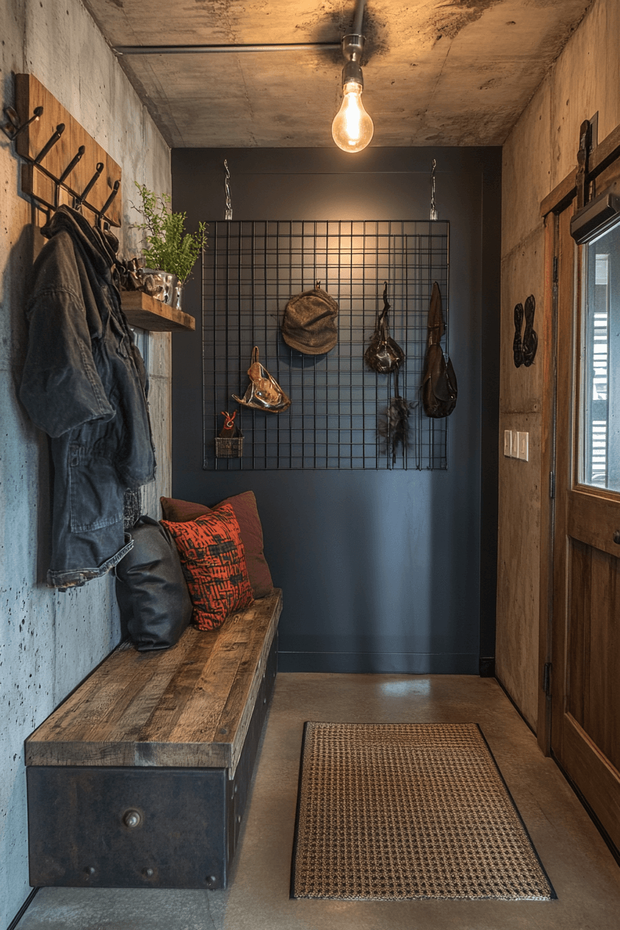 Raw finishes define a tiny apartment entryway with an industrial edge. Metal, concrete, and wood textures create contrast and visual interest. Compact seating and storage keep functionality intact. The look feels modern and intentional. Even small spaces can feel bold.