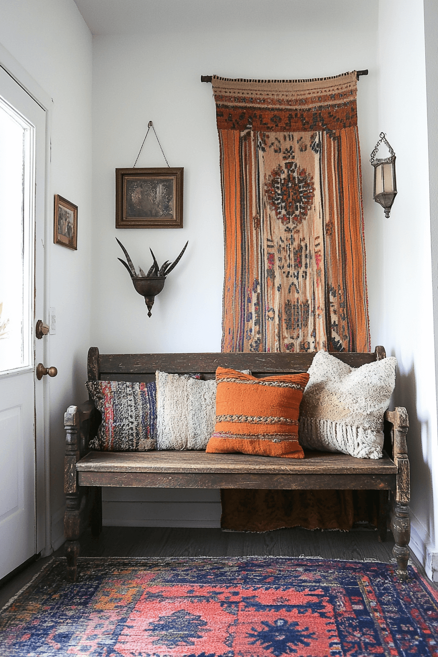 Layered textures energize a tiny apartment entryway styled with boho influence. Natural materials and playful patterns create relaxed charm. Storage doubles as decor. The space feels artistic and welcoming. Small entries gain personality.