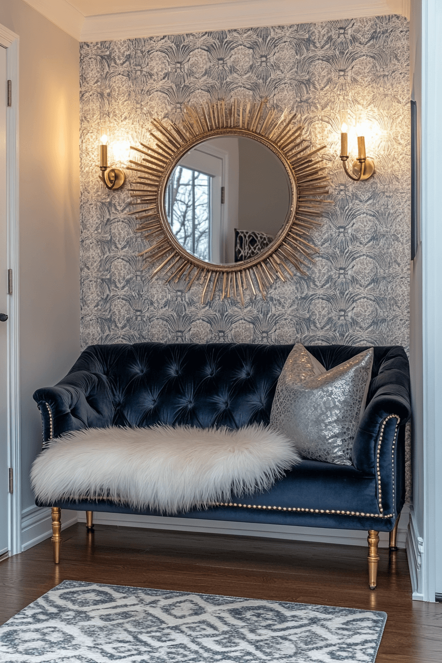 Glamorous finishes elevate a tiny apartment entryway with dramatic impact. Metallic accents, plush textures, and reflective surfaces add instant polish. Functional pieces remain compact and purposeful. The space feels luxurious without excess. Style takes center stage.