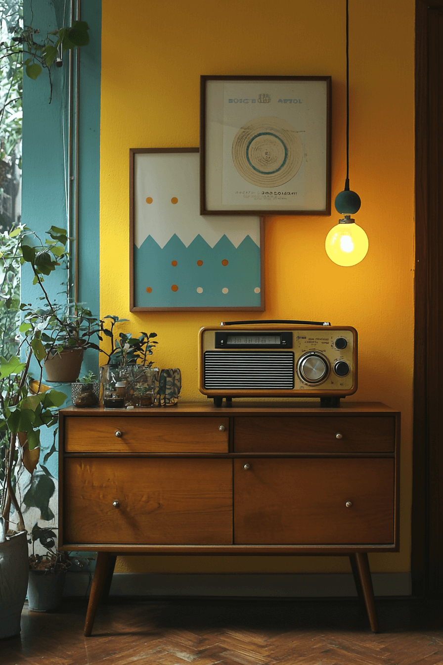 Playful nostalgia defines a tiny apartment entryway styled with retro charm. Colorful accents and vintage forms add joy and character. Functional pieces double as conversation starters. The space feels upbeat and expressive. Small entries can feel fun.