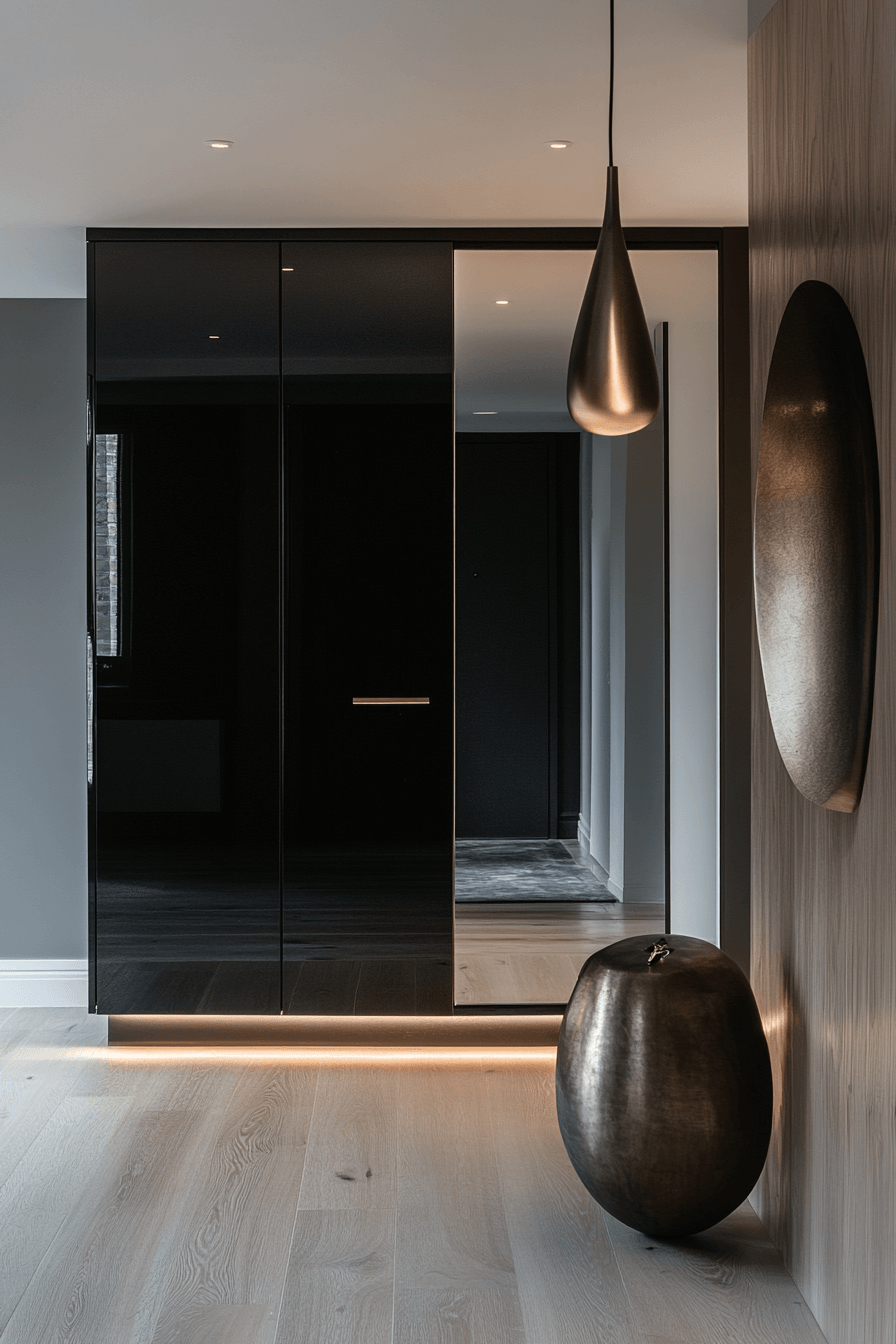 Glossy finishes instantly energize a tiny apartment entryway by reflecting light and enhancing depth. Sleek furniture and geometric accents keep the look modern and sharp. Hidden storage beneath benches maintains a clean appearance. The space feels brighter, larger, and more dynamic. Small entryways suddenly feel high-impact.