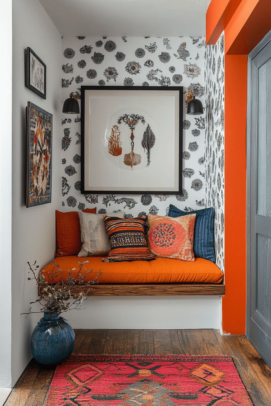 Bold personality defines a tiny apartment entryway styled with eclectic flair. Color, pattern, and mixed materials create visual excitement. Functional pieces still support everyday use. The space feels expressive yet organized. Small entries can be playful.