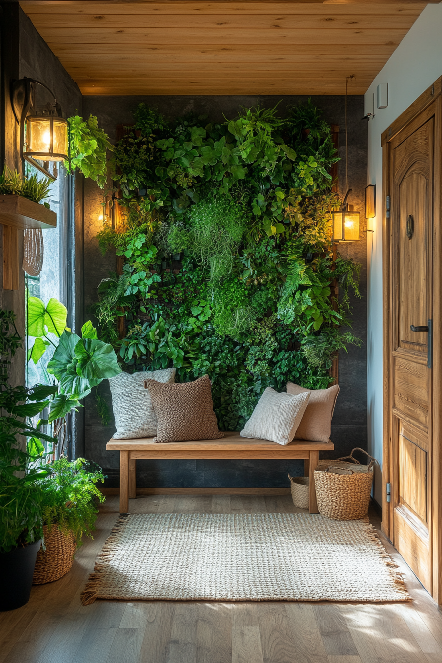 Nature-inspired accents refresh a tiny apartment entryway with calming energy. Greenery adds life while vertical displays preserve floor space. Soft textures balance the look. Organization stays practical and stylish. Wellness begins at the door.