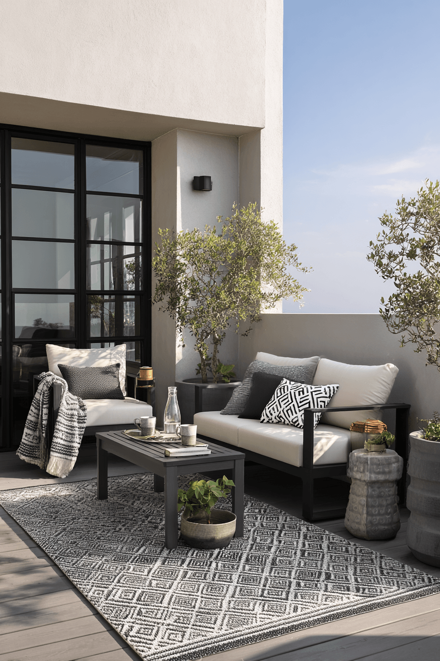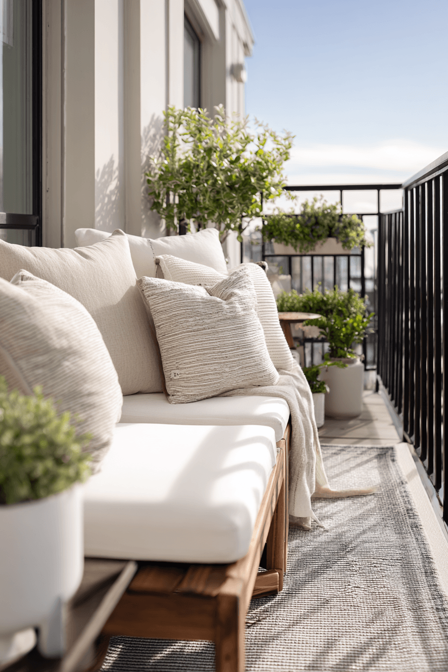 Turning a compact outdoor nook into a calming retreat starts with layered textures and thoughtfully chosen seating. Soft cushions, warm wood accents, and subtle greenery help very small balcony decor feel open and welcoming instead of crowded. A petite outdoor rug defines the area while adding cozy, indoor-style comfort. Natural elements paired with clean lines keep everything balanced and visually fresh. Light fabrics move gently with the breeze, bringing softness and life to the space. Every detail feels both practical and polished for everyday use. Step into this cozy outdoor escape today.