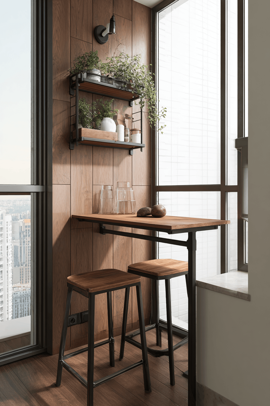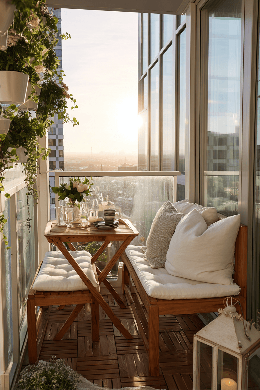 Bright tones and reflective surfaces create an uplifting atmosphere that enhances very small balcony decor. Light woods, soft whites, and airy fabrics help bounce natural light throughout the space. A compact table with slim seating forms a perfect everyday setup. The vibe feels fresh and energizing, especially during morning or sunset hours. Subtle accents add charm without overwhelming the design. Everything feels open, functional, and easygoing. Refresh your balcony with this bright idea.
