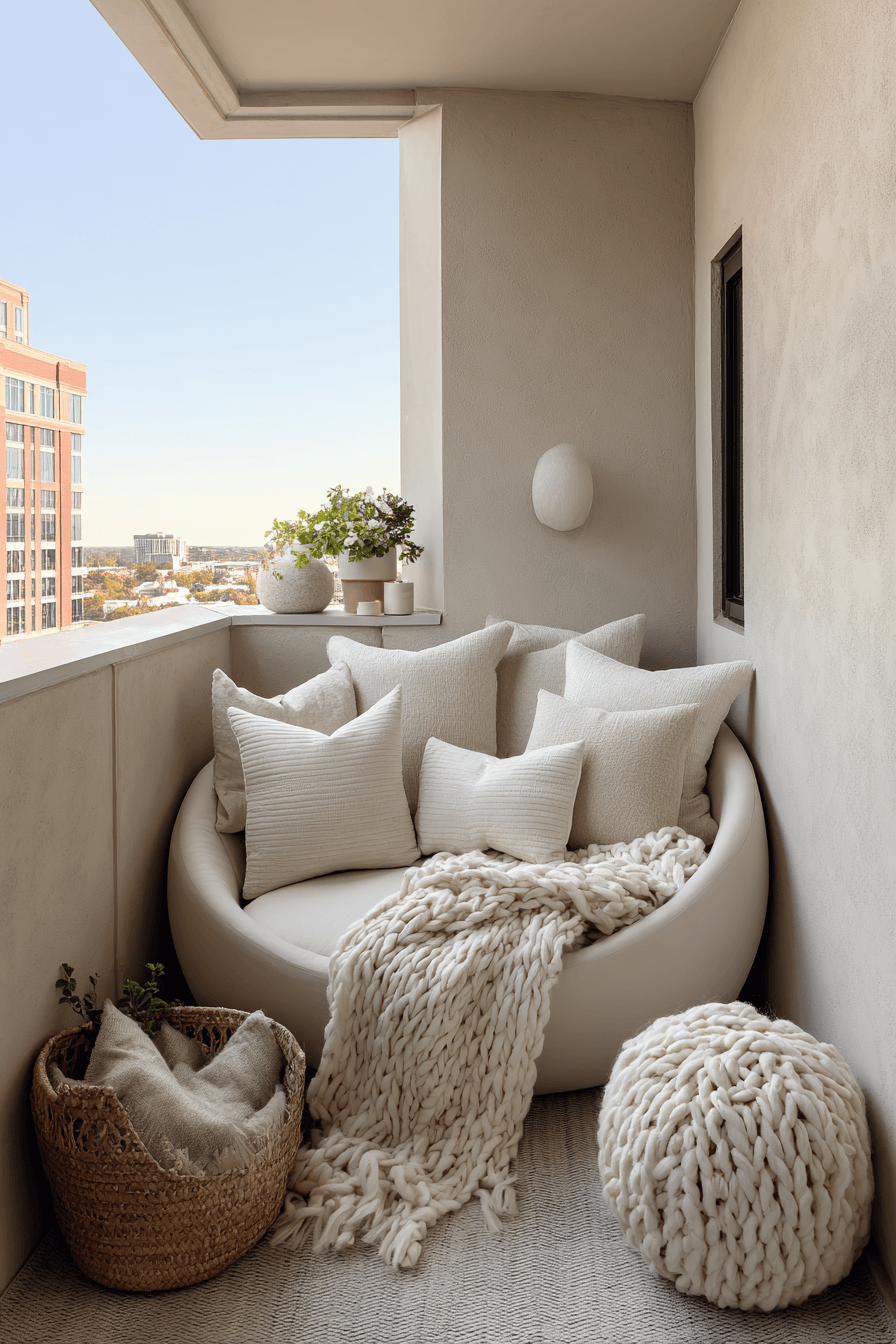 Curved seating and layered textures create a cozy cocoon effect that enhances very small balcony decor. Soft cushions and rounded shapes bring comfort and warmth instantly. A throw blanket adds an extra inviting touch. Neutral tones let the textures shine beautifully. The atmosphere feels private and tucked away. Compact furniture keeps everything seamless and uncluttered. Create your own cozy hideaway today.