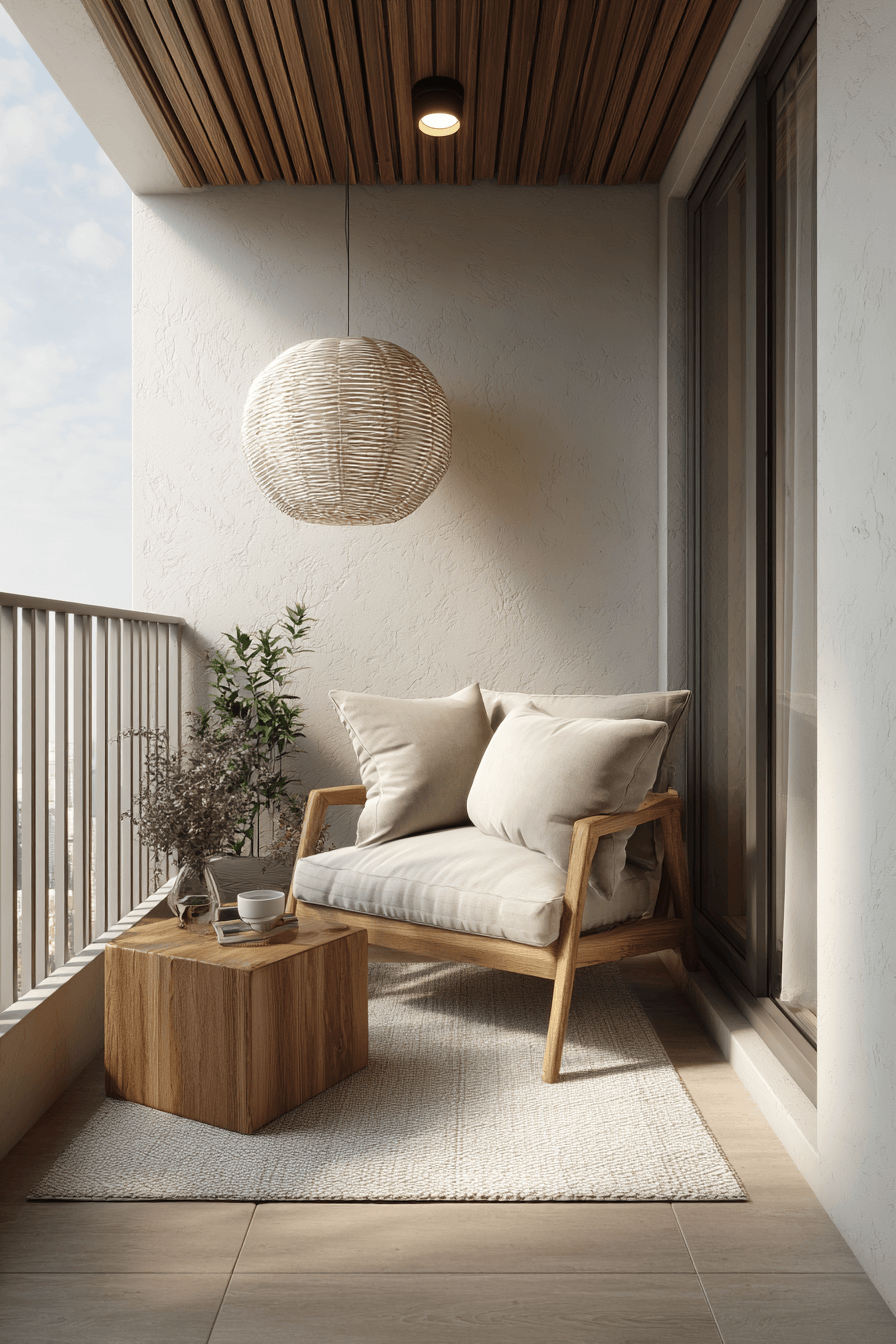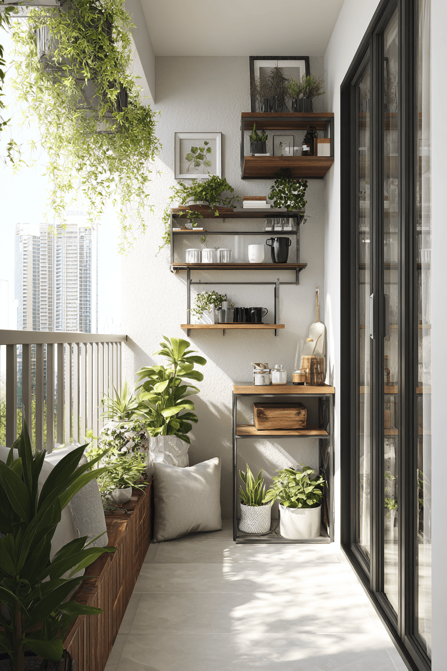 Making use of vertical space transforms very small balcony decor into something dynamic and functional. Shelves and wall-mounted planters draw the eye upward, making the space feel taller. Mixing greenery with decor adds depth without using floor space. Lightweight materials keep everything airy and balanced. The vibe feels fresh and lively with natural elements. Movement and comfort remain effortless. Maximize your balcony potential with this smart idea.