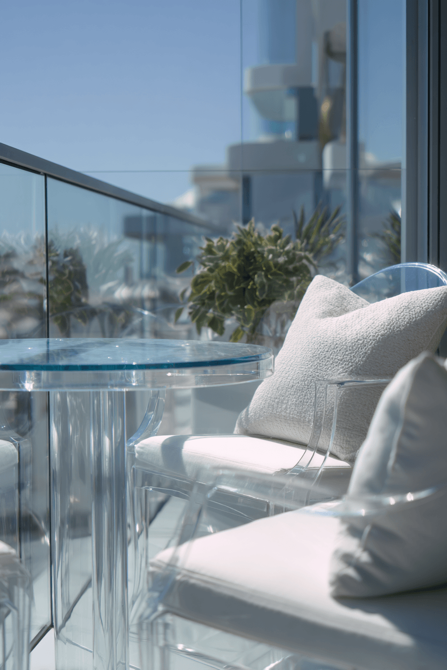 Glass elements bring openness and light to very small balcony decor, making the space feel expansive. Transparent surfaces allow light to flow freely throughout the area. Soft fabrics balance the sleekness and add comfort. The overall feel is calm and modern with understated elegance. Minimal decor keeps the focus on openness. Even small reflective accents enhance the airy effect. Create a clean, open balcony look today.