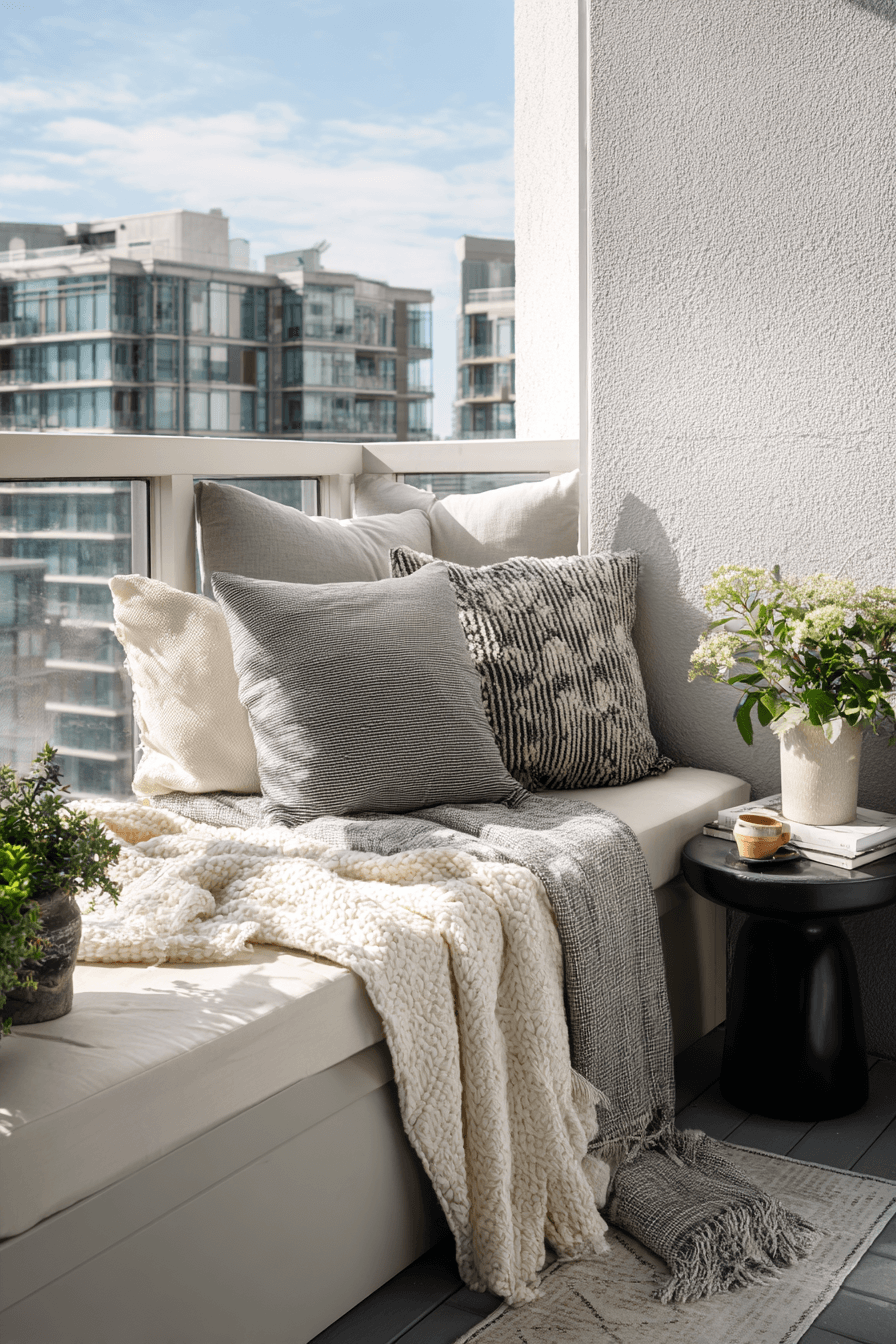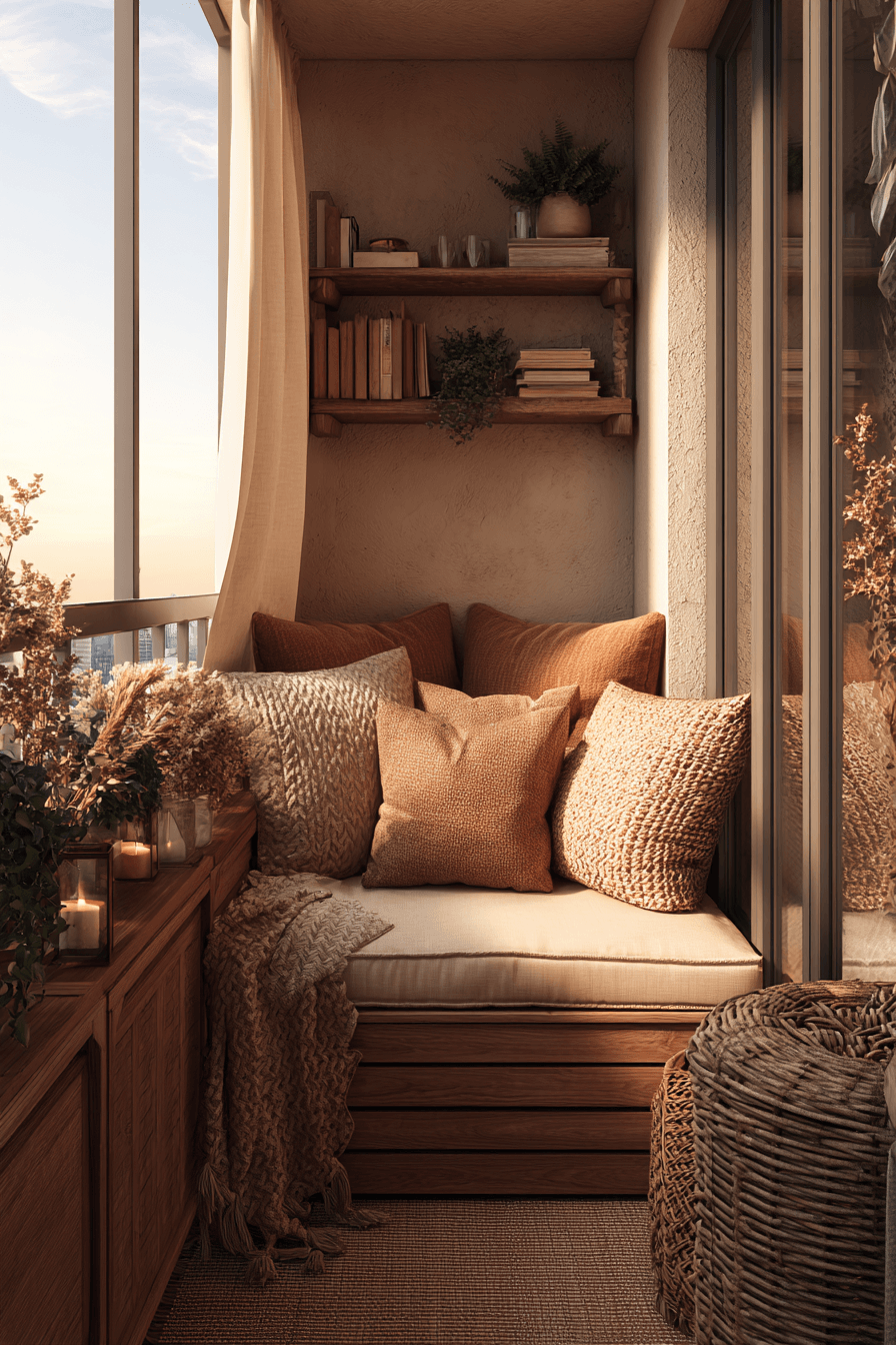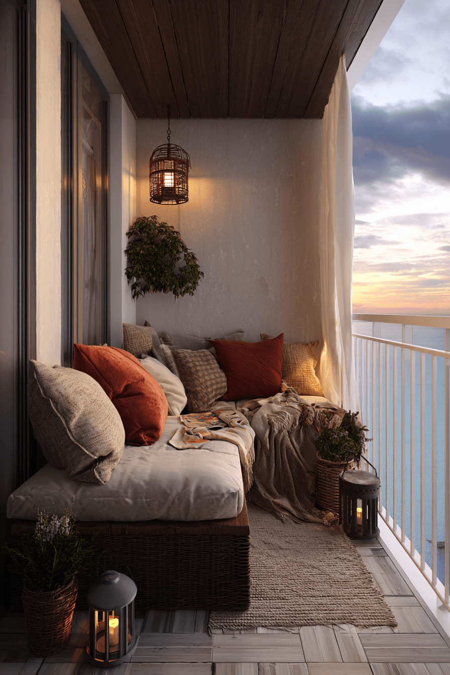 Wrapping the space in warmth with cozy textiles creates an inviting setup for very small balcony decor. Soft throws, compact seating, and warm tones make the area feel intimate and comfortable. Woven textures and natural finishes add dimension without taking up space. A thoughtful layout keeps everything functional while still relaxed. Gentle lighting enhances the atmosphere, especially in the evening. The entire space feels like a quiet retreat just outside your door. Bring this cozy vibe to life on your balcony.