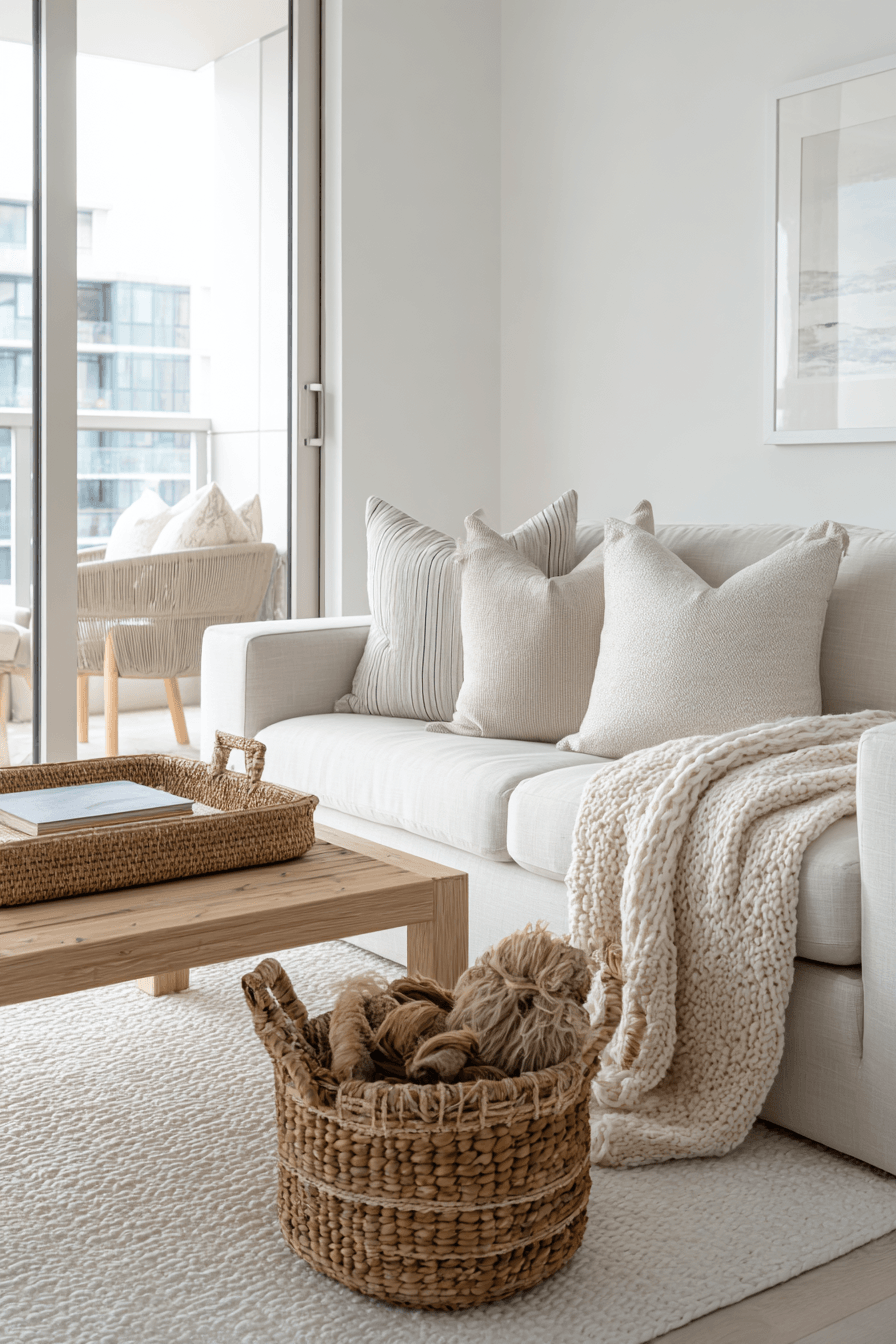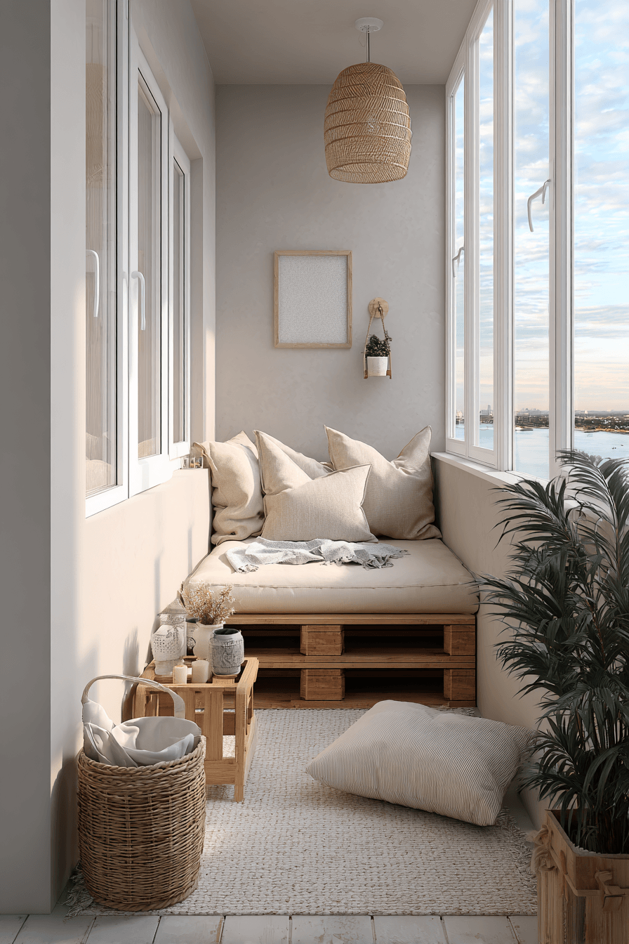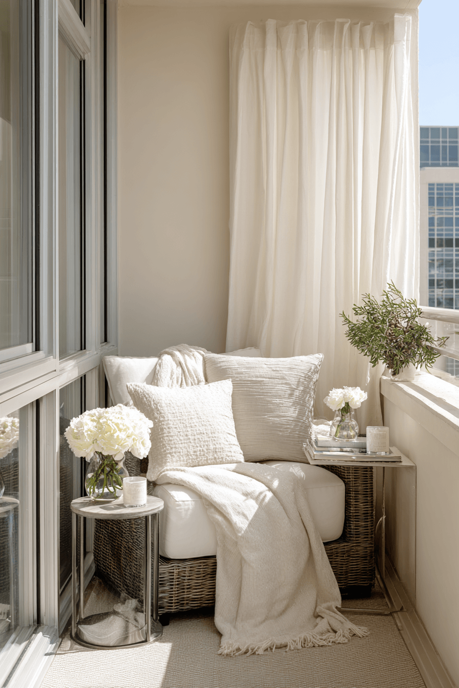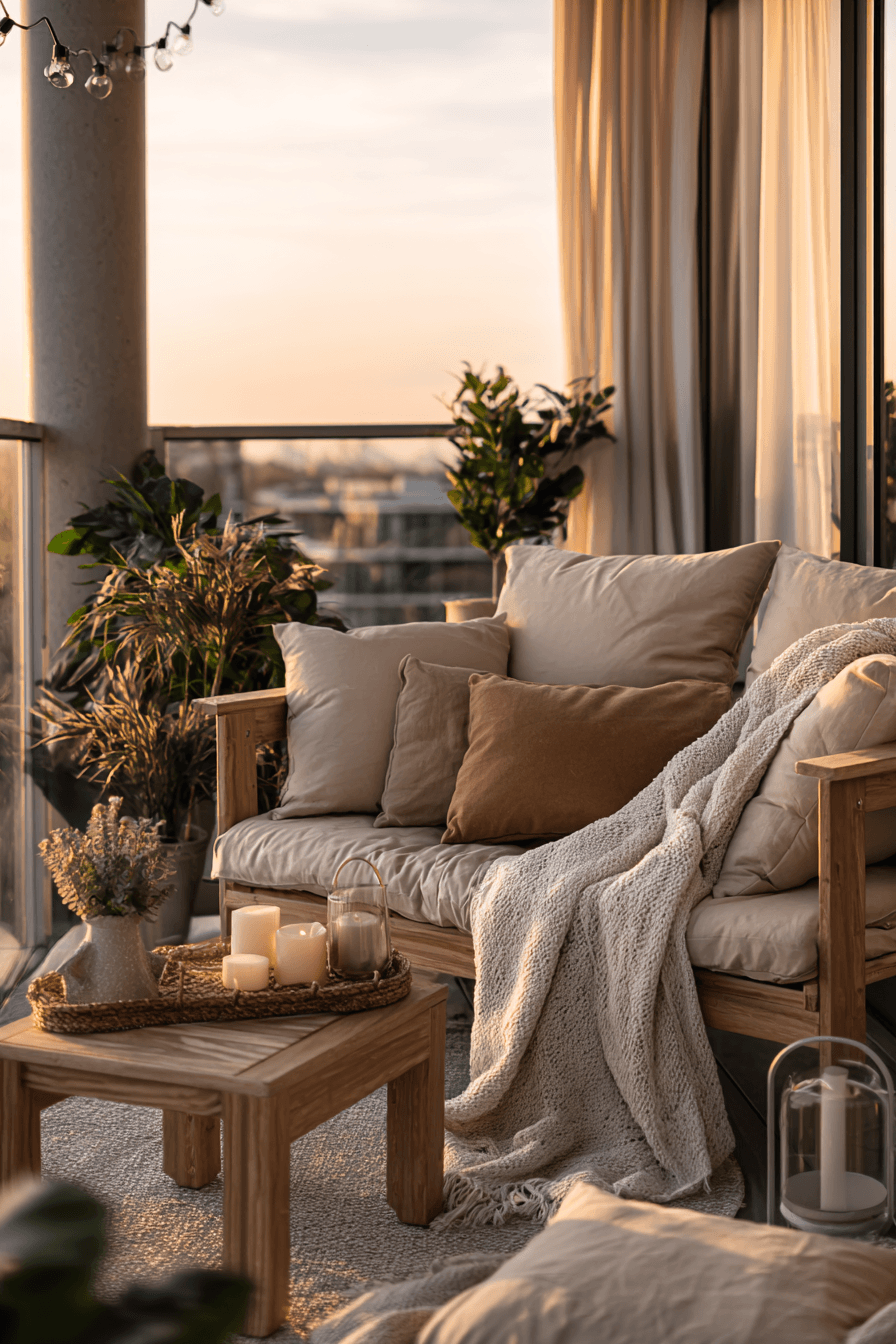Wrapping the space in warmth with cozy textiles creates an inviting setup for very small balcony decor. Soft throws, compact seating, and warm tones make the area feel intimate and comfortable. Woven textures and natural finishes add dimension without taking up space. A thoughtful layout keeps everything functional while still relaxed. Gentle lighting enhances the atmosphere, especially in the evening. The entire space feels like a quiet retreat just outside your door. Bring this cozy vibe to life on your balcony.