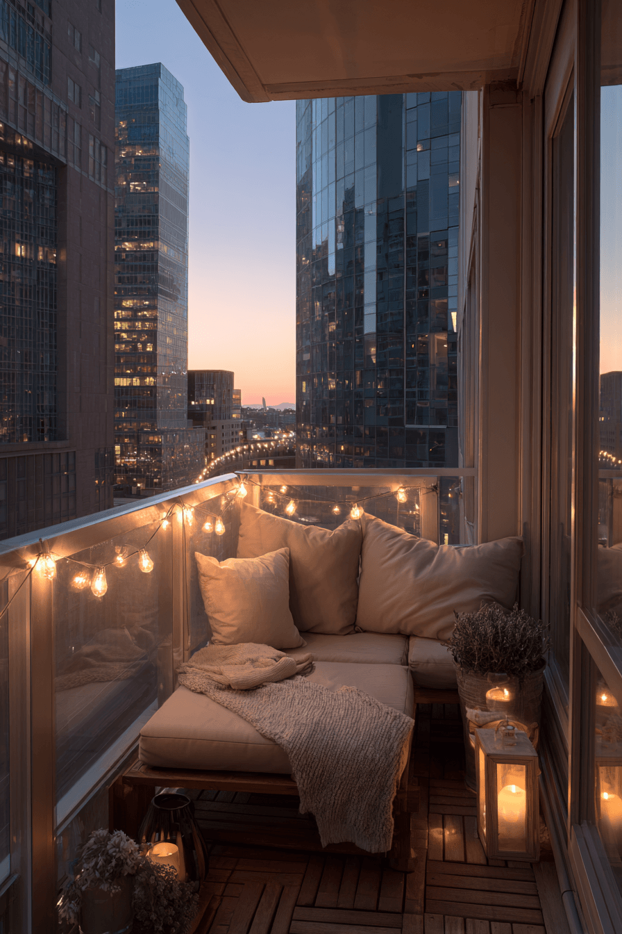 Soft lighting and gentle textures turn the balcony into a dreamy retreat within very small balcony decor. Warm lights create a calming glow during evening hours. A neutral palette blends seamlessly with surrounding views. Minimal furniture keeps the focus on relaxation and scenery. Subtle textures keep everything balanced and soft. The mood feels peaceful and slightly romantic. Transform your balcony into a dreamy escape.