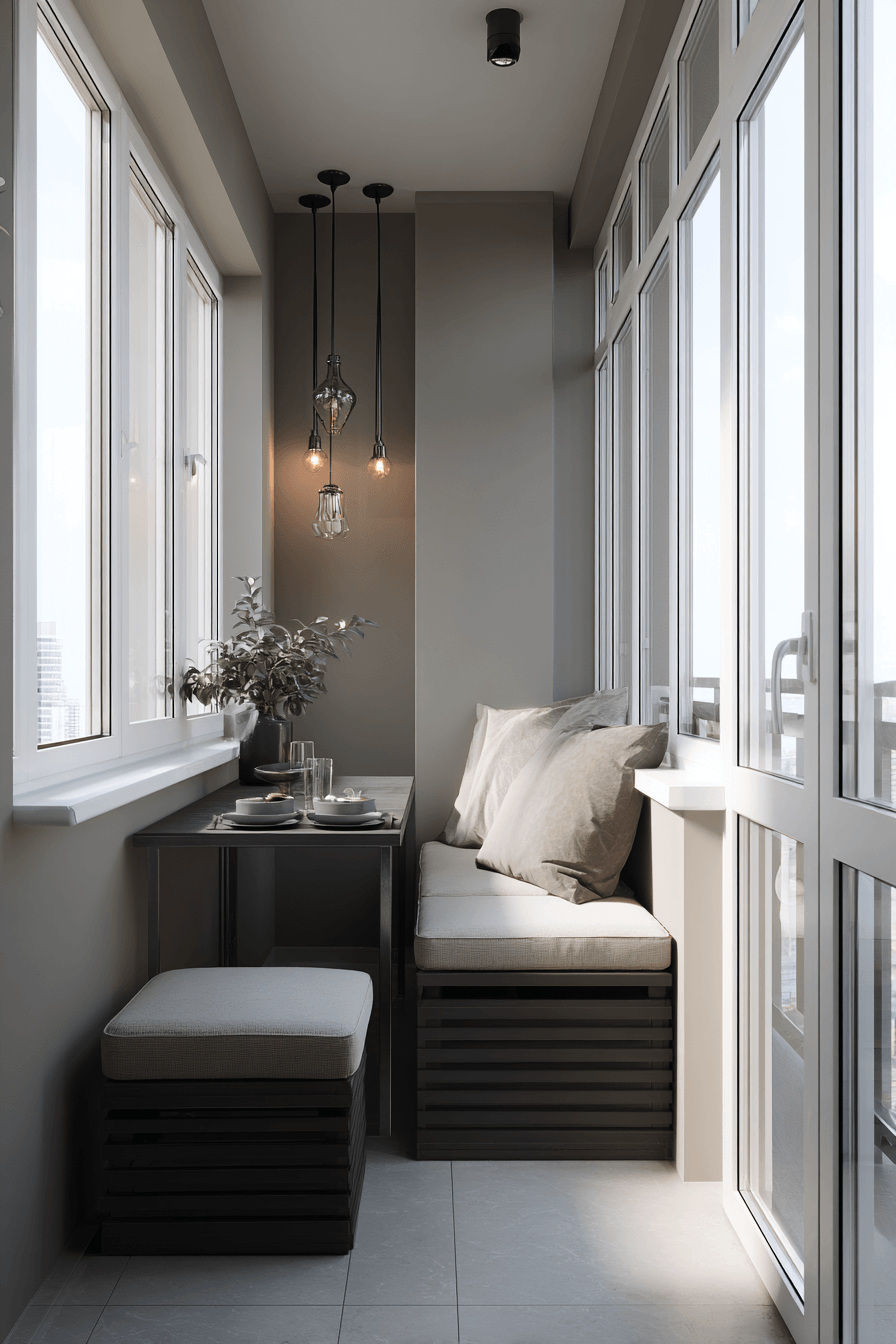 Integrated features make very small balcony decor more functional and efficient. Built-in shelves and railing tables maximize overlooked areas. Streamlined layouts keep the space open and uncluttered. Soft contrasts add visual interest without distraction. Every piece serves a purpose. The design feels practical and modern. Explore this smart balcony solution.