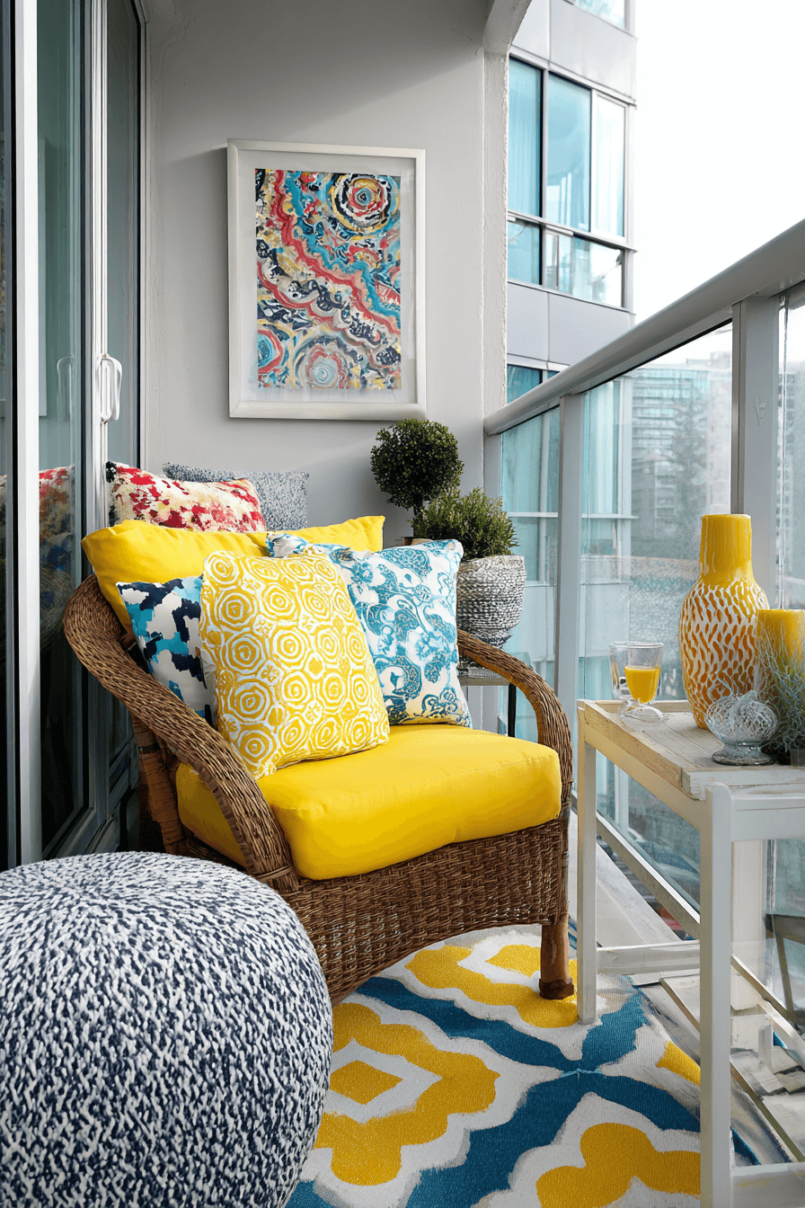 Bold accents and vibrant textures energize very small balcony decor with personality. Pops of color bring life without overwhelming the space. Simple base furniture allows decorative elements to stand out. Layered textures create a dynamic and lively feel. The atmosphere feels cheerful and uplifting. Durable materials keep everything practical. Add a burst of energy to your balcony today.