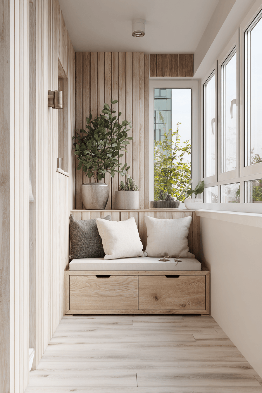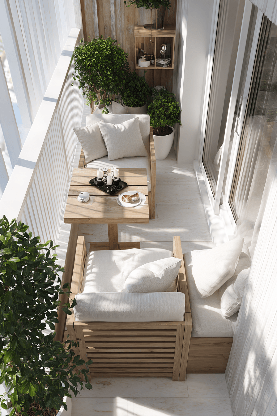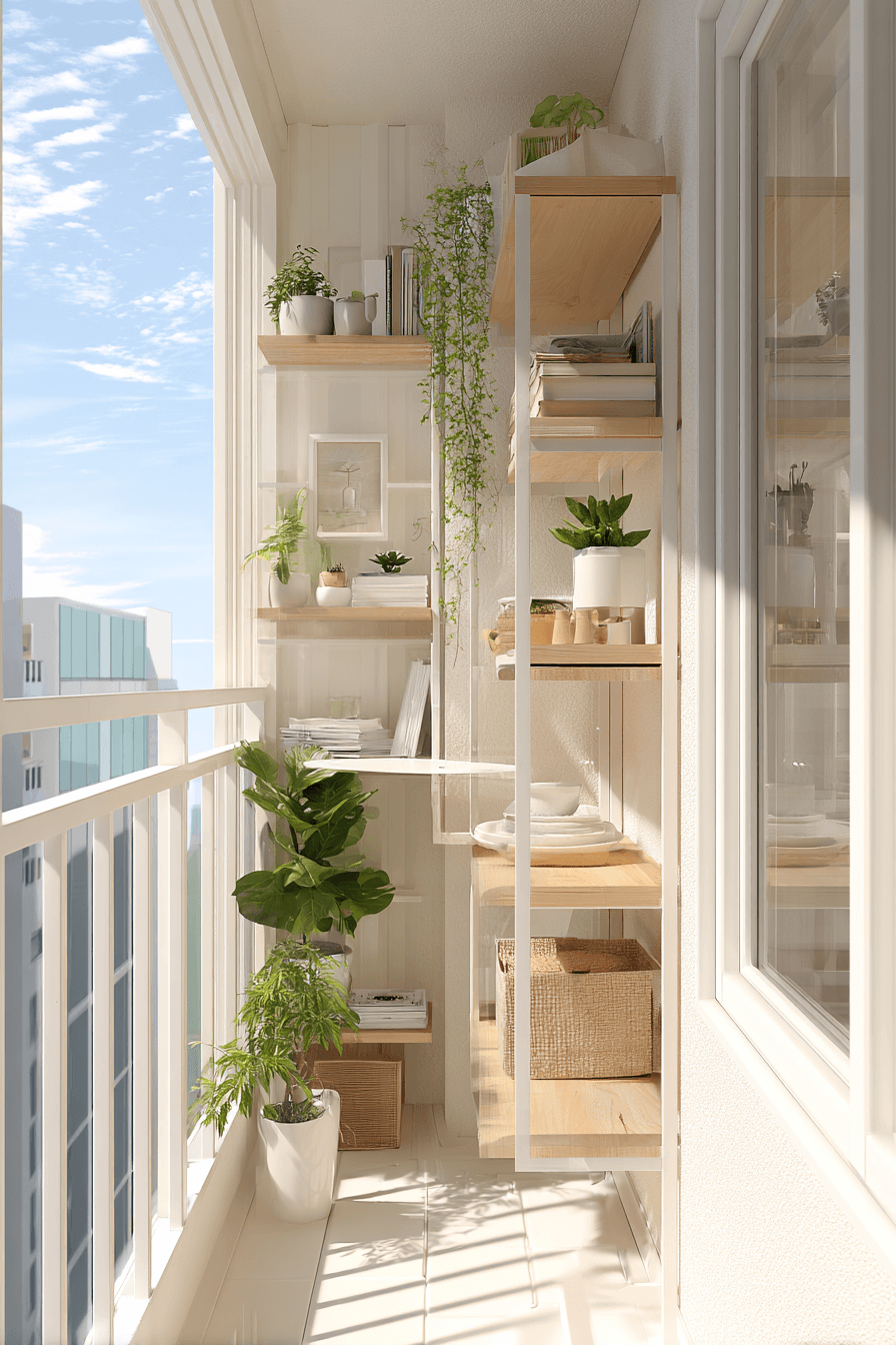 Light materials and vertical storage create a breezy, efficient layout for very small balcony decor. Slim shelving frees up valuable floor space. Soft tones keep the design airy and uncluttered. Functional pieces double as decor for added practicality. The layout feels natural and effortless. Everything works together seamlessly. Discover this space-saving balcony idea.