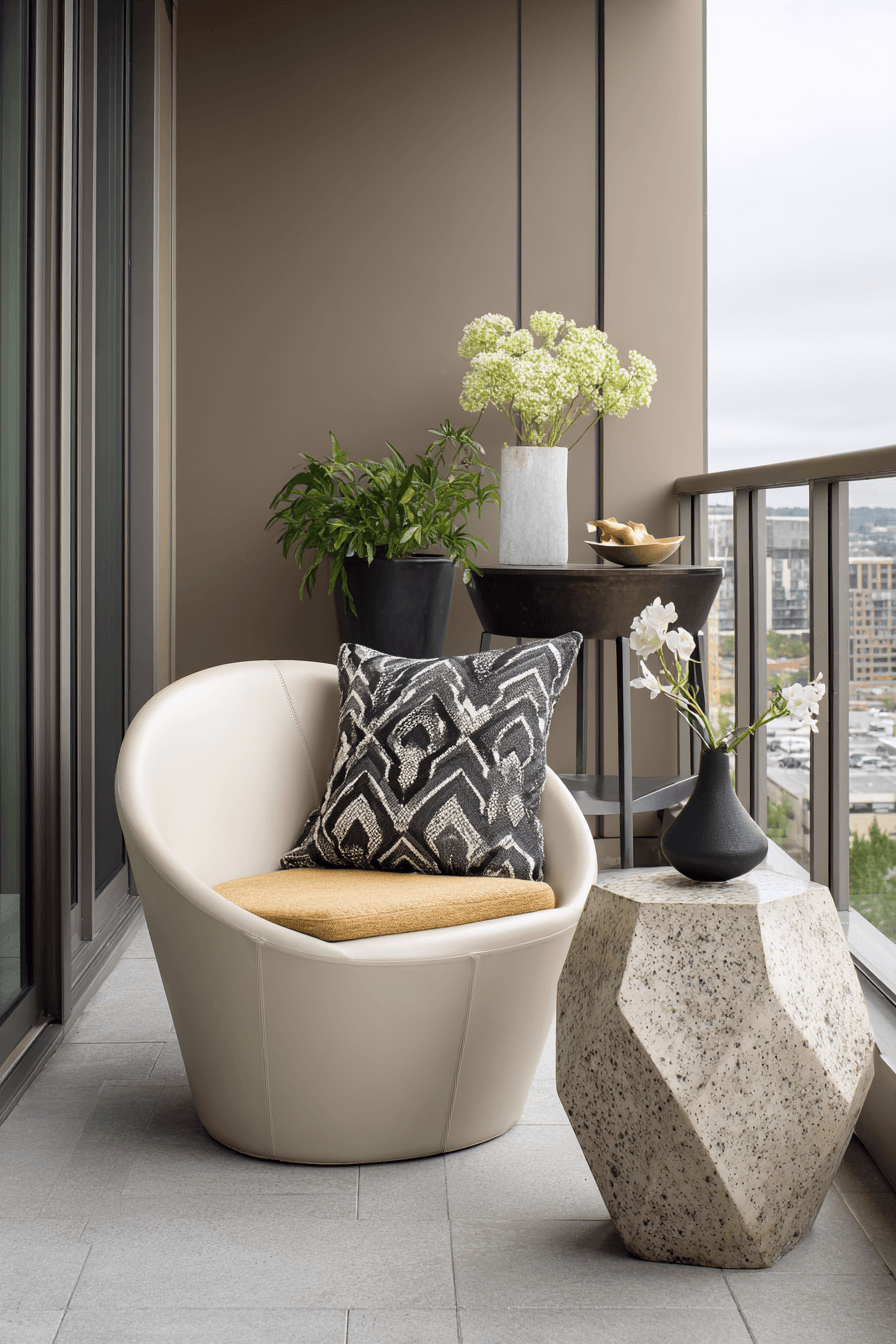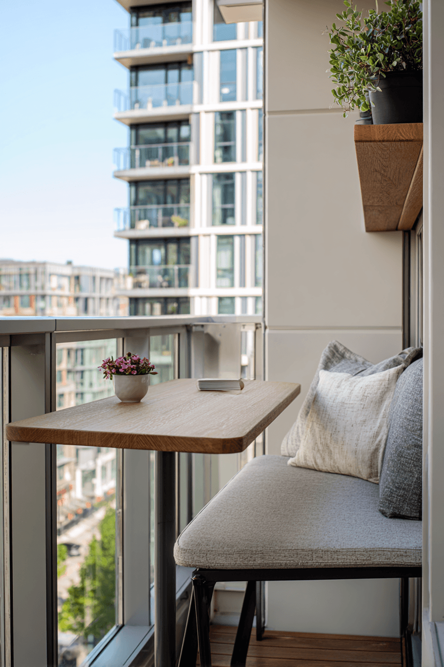 Modern shapes and compact pieces redefine very small balcony decor with a fresh, stylish edge. Unique silhouettes add visual interest without taking up space. A neutral palette with subtle contrast keeps everything cohesive. The layout feels practical yet thoughtfully designed. Small accents bring personality without clutter. The vibe feels current and livable. Refresh your balcony style effortlessly.