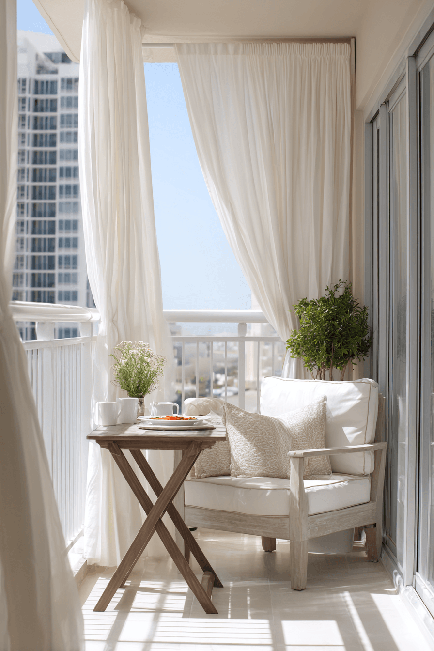 Light fabrics and minimal furniture create an airy and open atmosphere for very small balcony decor. Flowing curtains add softness and movement that make the space feel inviting. Low-profile furniture keeps sightlines clear, helping the area appear larger. A palette of whites and pale tones reflects natural light beautifully. Natural materials bring warmth while maintaining a light feel. A touch of greenery adds life without crowding the layout. Create your own airy outdoor escape today.